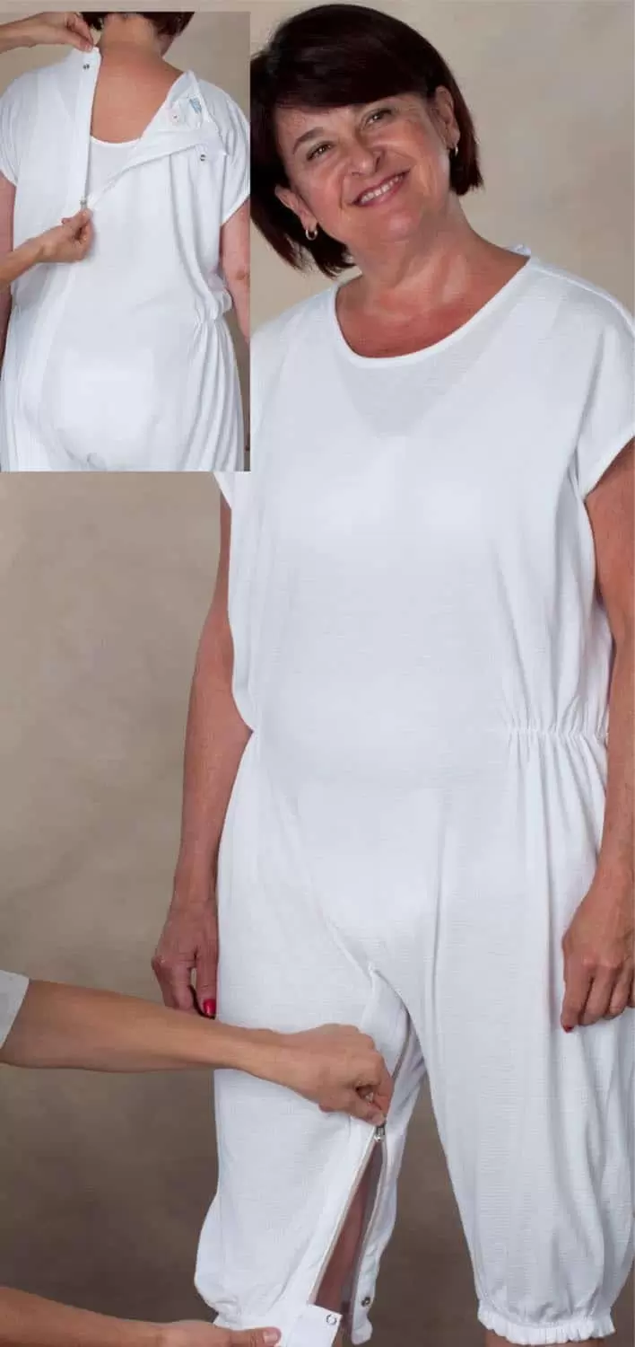 Les combinaisons de jour une pièce fait en poly/coton doux sont résistantes, confortables et sans contention. Elles assurant le respect et la dignité des personnes atteintes de la maladie d’Alzheimer, de toute autre forme de démence, ou de troubles cognitifs, en leur restreignant l’accès aux sous-vêtements d’incontinence et leur empêchant de se dévêtir. La combinaison est munie d’une longue fermeture éclair au dos se sécurisant avec un bouton à pression au haut, d’une fermeture éclair à l’intérieur des jambes se sécurisant elle aussi avec des boutons à pression de chaque côté, de manches courtes, et de jambes longues aux genoux. Elle est robuste et résistante, et permet un habillage pratique pour l’aidant et indolore pour le ou la bénéficiaire. Cette combinaison unisexe est offerte en blanc et est idéale pour porter sous les vêtements réguliers durant la journée.