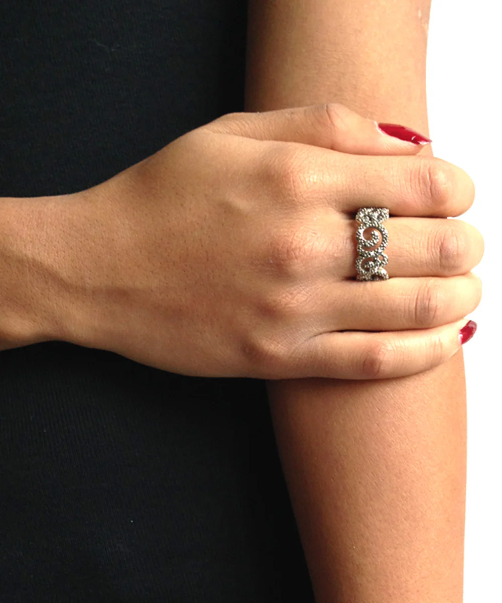Description Bague anneau en argent et marcassite Motif arabesques.Largeur anneau : 0,8 cm La Marcassite est une pierre minérale, provenant du cristal de pyrite, utilisé pour valoriser une autre pierre, notamment sur des montures en argent. Les marcassites sont taillées de forme ronde ou carrée et serties pour former un pavage qui resplendit comme des […]