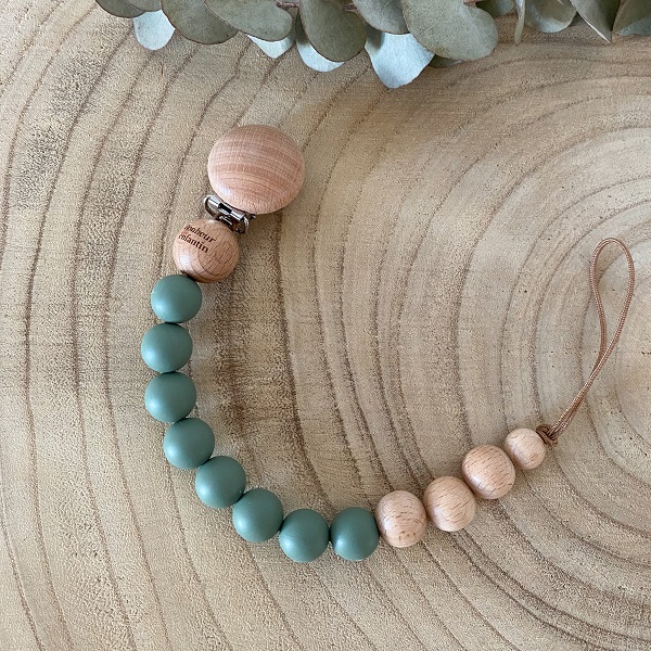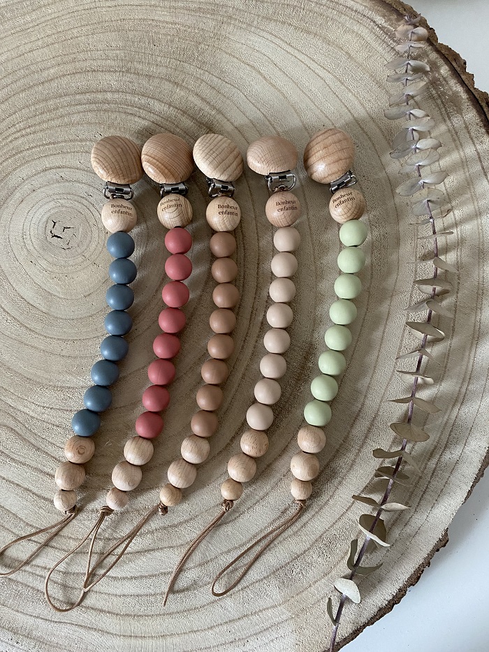 Pratique pour les parents et amusant pour bébé !! Fabriquées à partir de perles en silicone alimentaire et en bois de hêtre non traité. L’attache tétine donne une stimulation tactile grâce au jeu de relief des perles et des matières. Pour plus de sécurité les attaches tétine sont confectionnées avec un cordon polyester ultrarésistant. La longueur du clip à la dernière perle est de 21 cm. Et la longueur totale est de 27 cm.