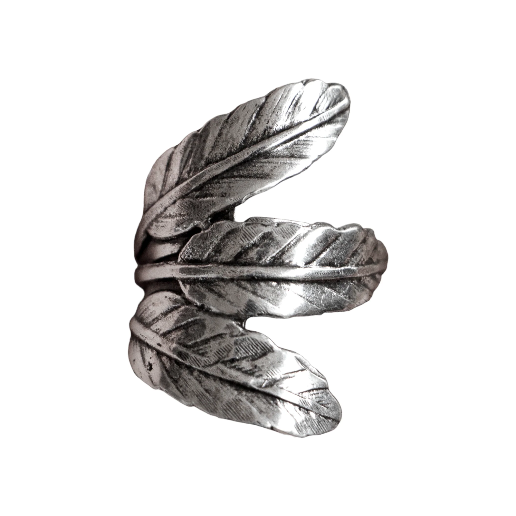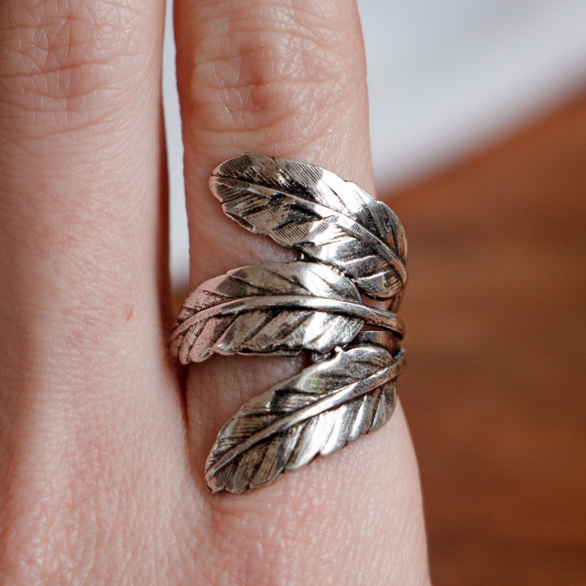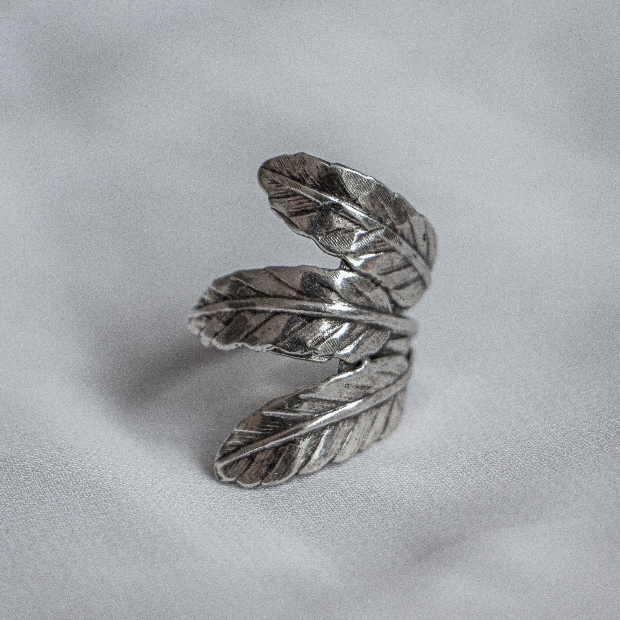 Bague 3 Plumes – Bague en laiton argenté, patinée – Bague ajustable – Sans Nickel – Livré avec une pochette tissée principale
