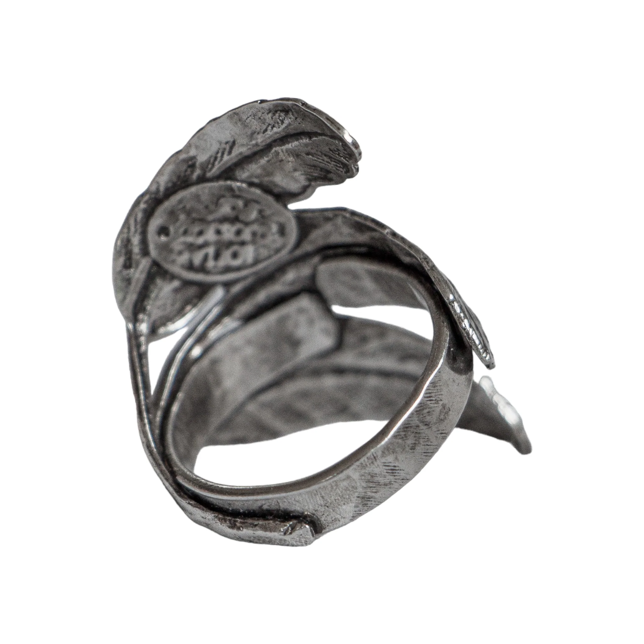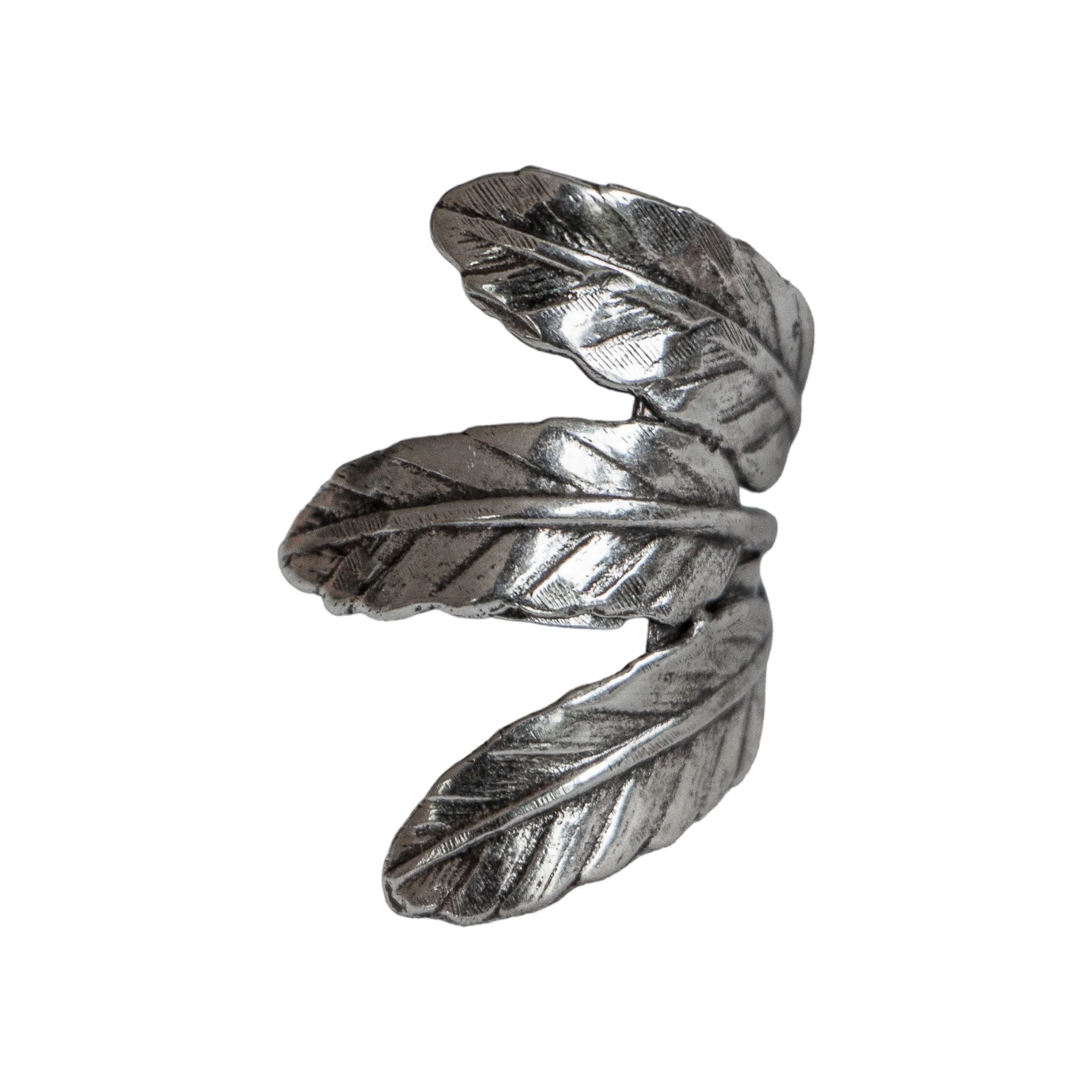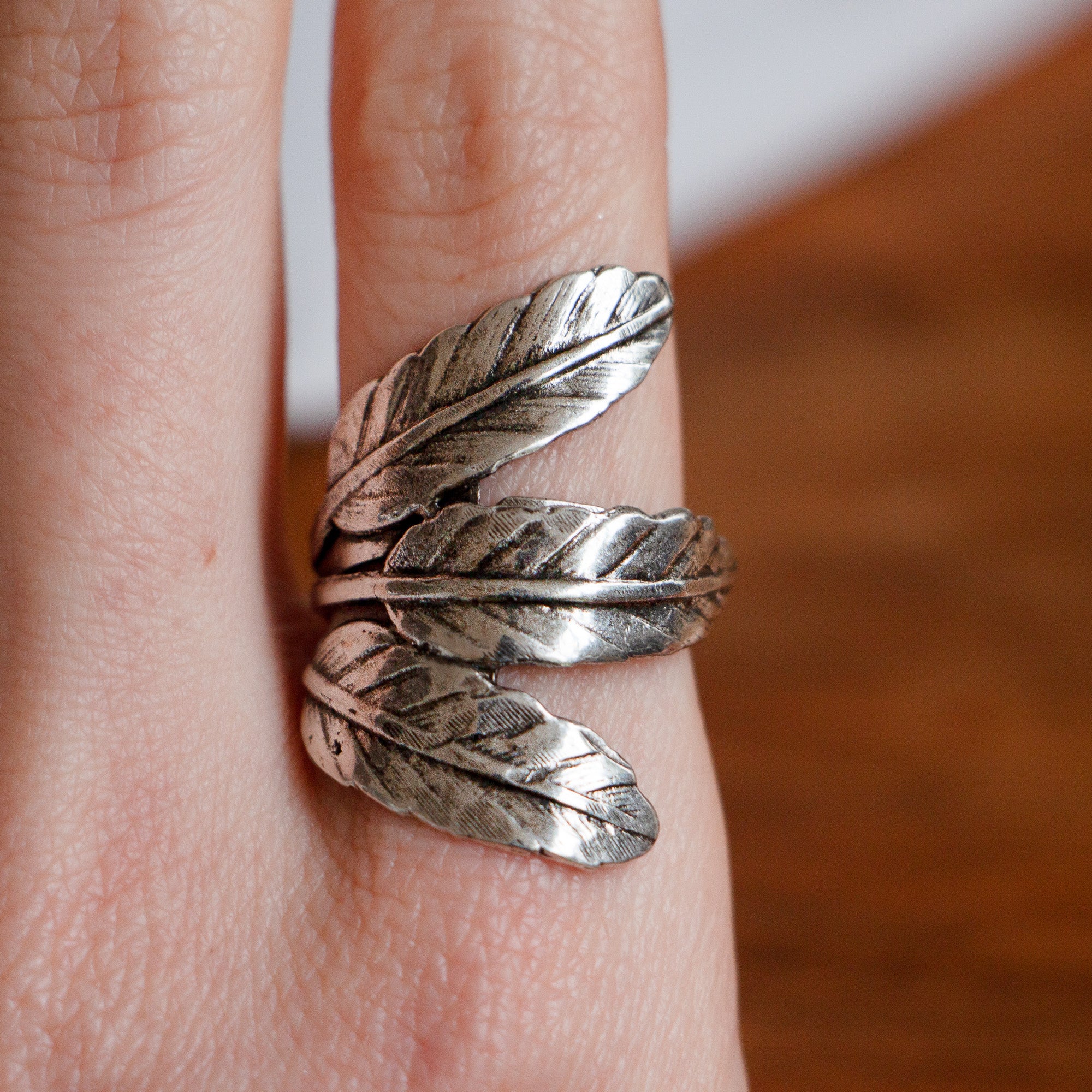 Bague 3 Plumes – Bague en laiton argenté, patinée – Bague ajustable – Sans Nickel – Livré avec une pochette tissée principale
