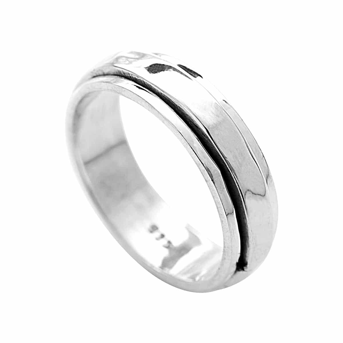 Bague Alexandrine, une pièce élégante et moderne en argent massif 925%. Cette bague se compose de deux anneaux superposés, avec une largeur de l’anneau de base de 5 mm et celle de l’anneau martelé de 3 mm. Avec un poids de 6.35 g, elle allie confort et style.