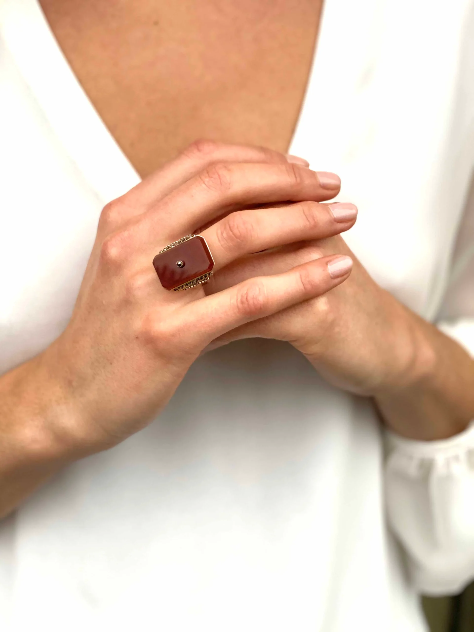 Bague cornaline art déco en argent 925 et marcassites avec une petite marcassite centrale.