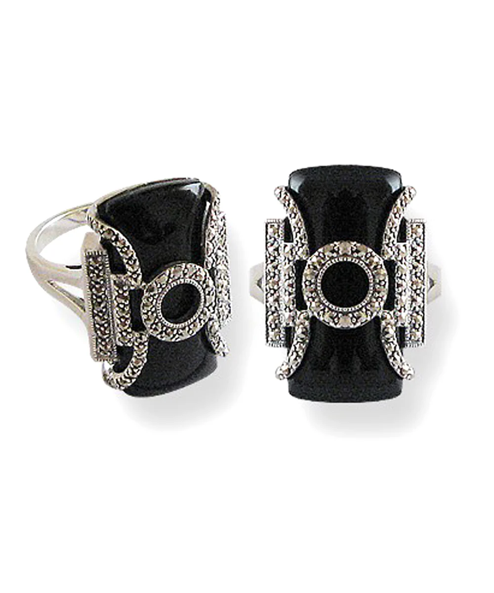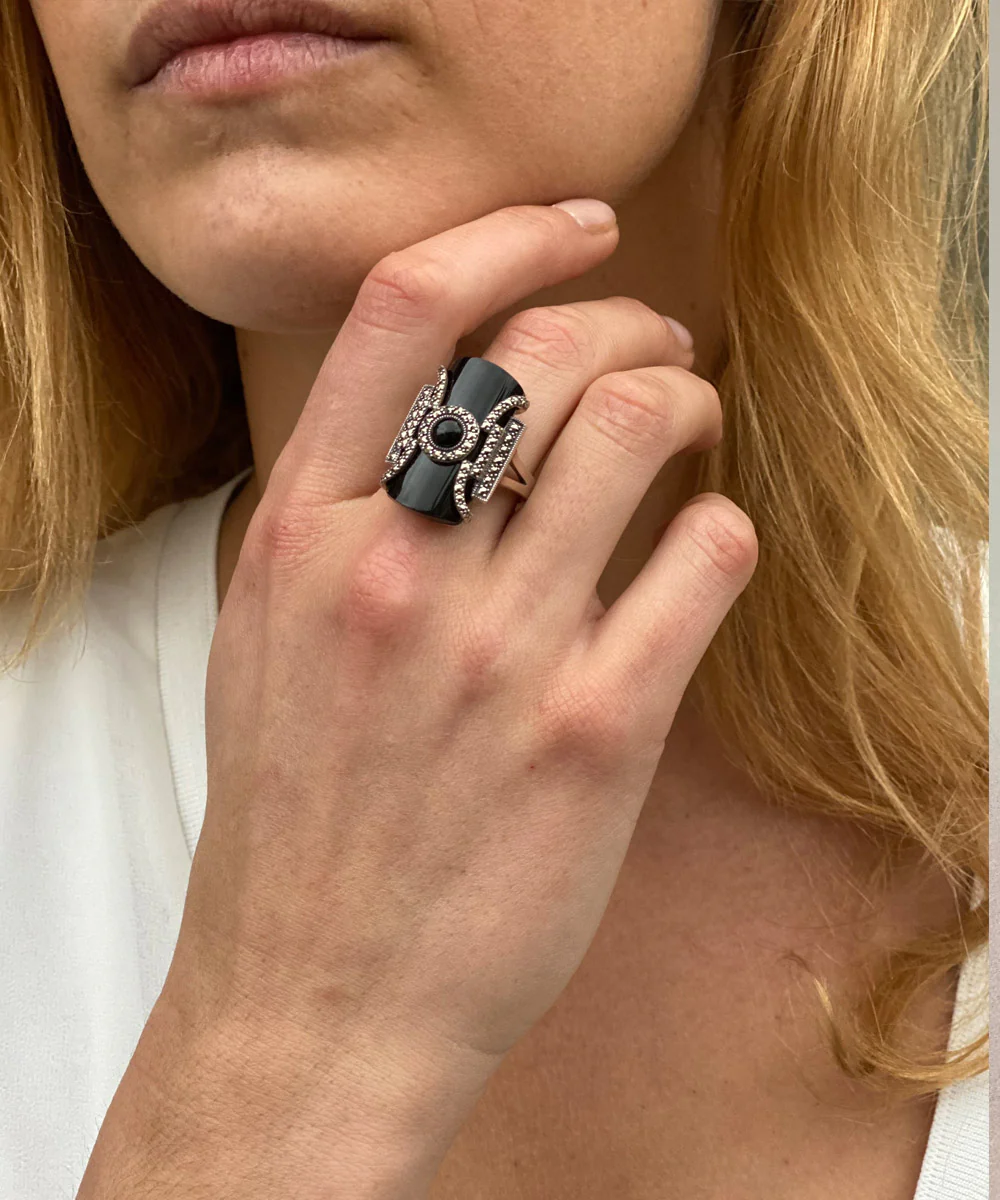 Bague onyx art déco en argent 925 et marcassites avec une perle centrale noire.
