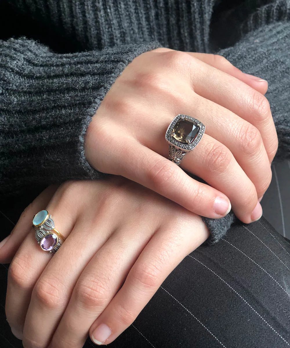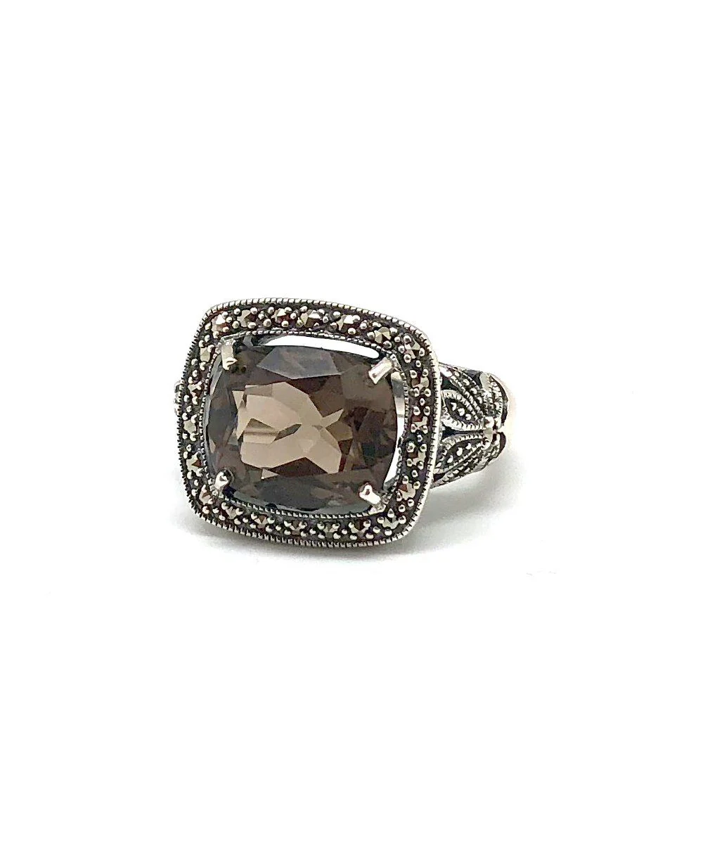Bague art deco quartz fumé en argent 925, et marcassites.