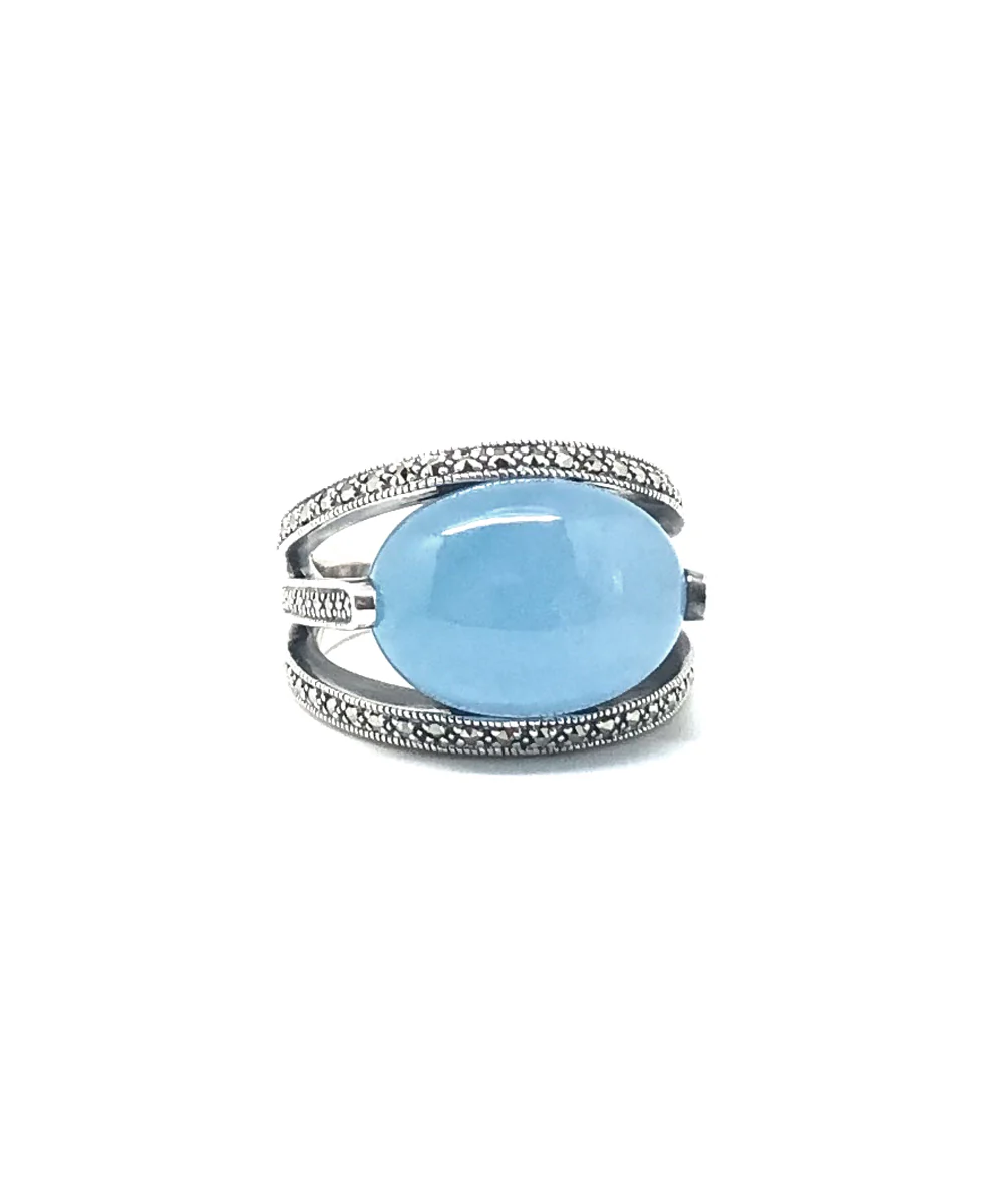 Bague jade bleu art déco ovale en argent 925 et marcassites
