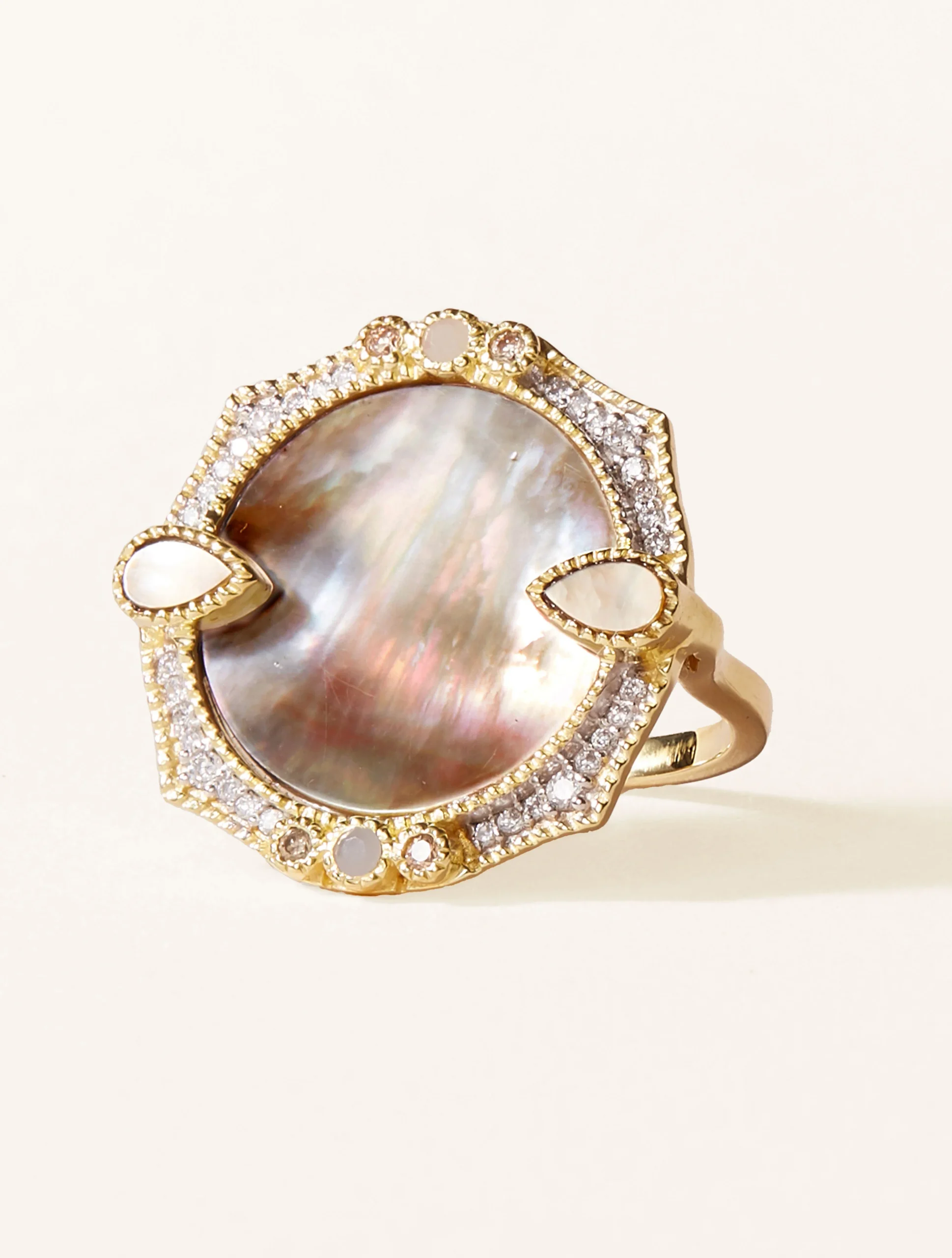 La bague Janih en nacre rose, d’inspiration art deco, est conçue pour habiller n’importe quelle tenue, de la plus classique à la plus audacieuse.