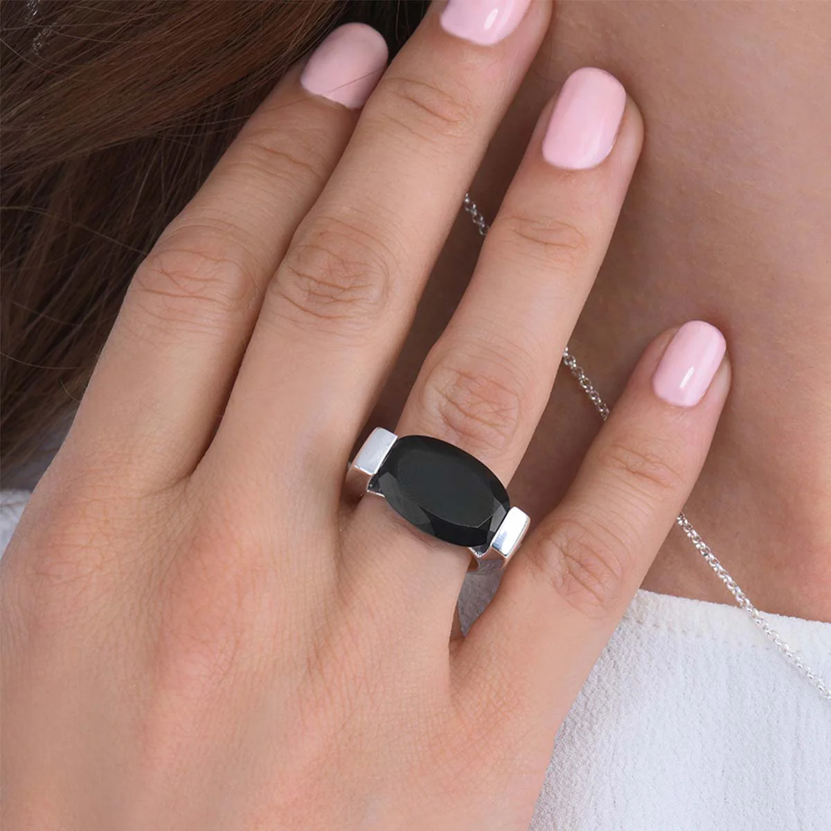 - Couleur : Pierre noire profonde contrastant avec l’anneau poli en argent.