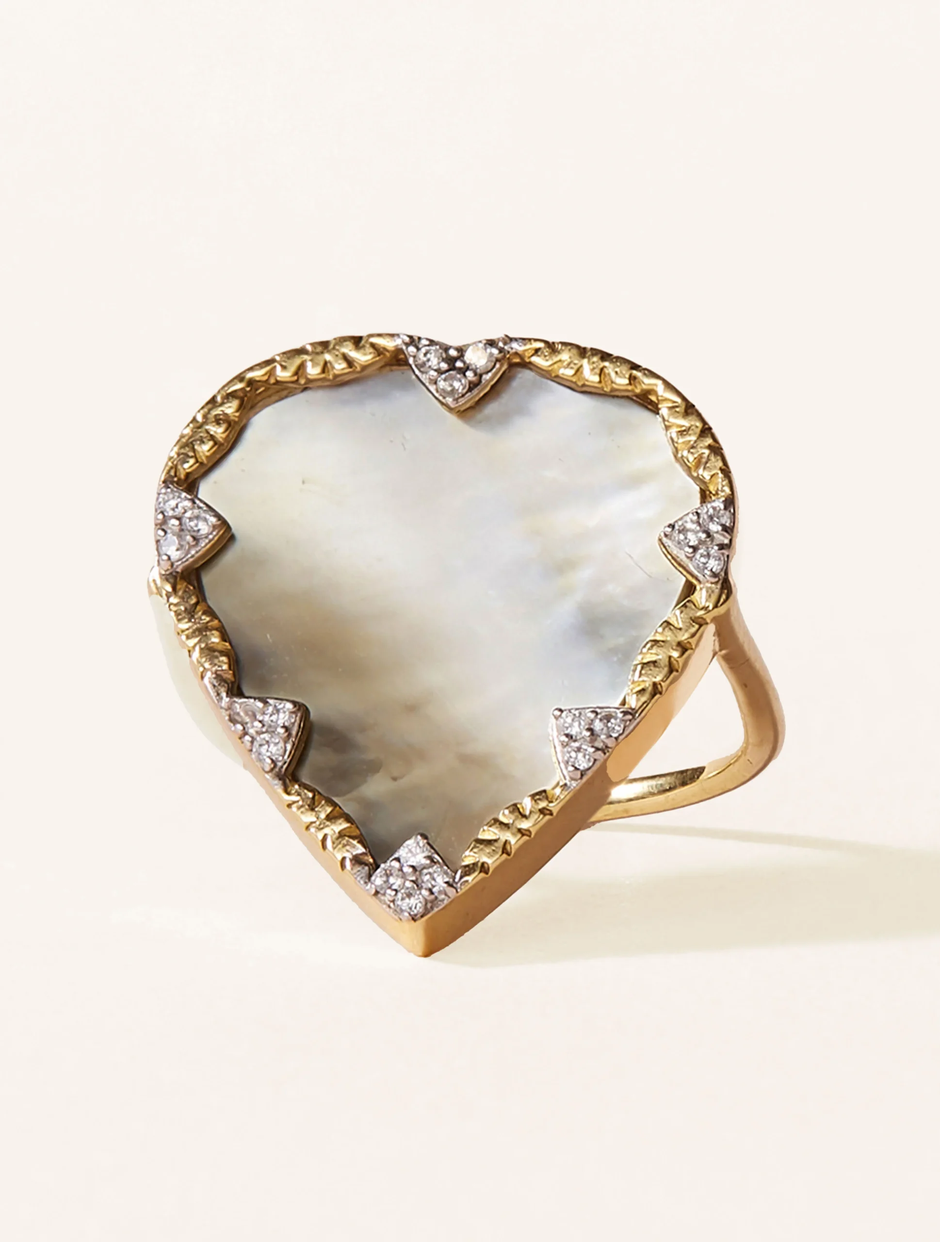 La bague Lima en Nacre grise révise avec subtilité la forme du coeur, ornée de pierres fines singulières et allie avec audace or et argent.