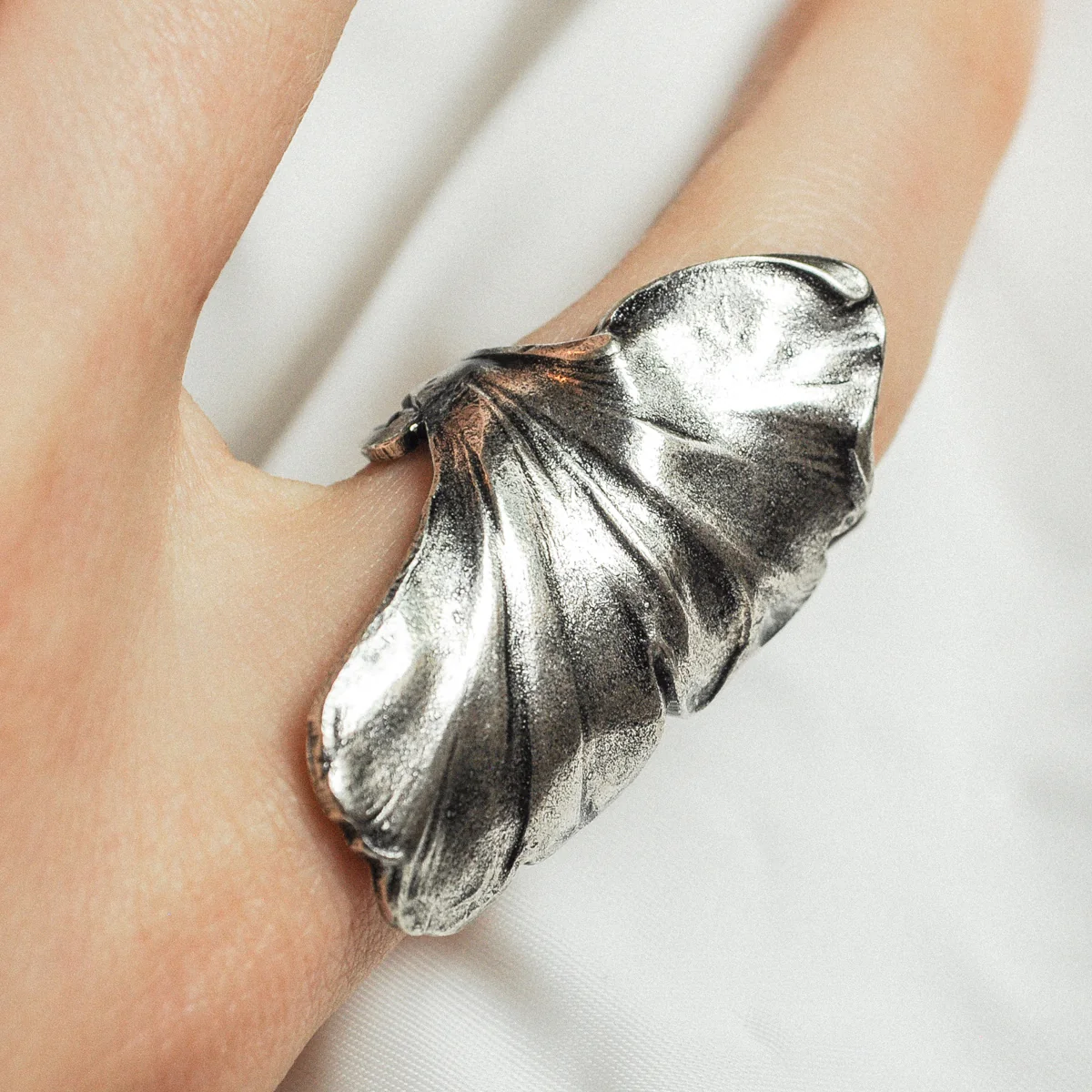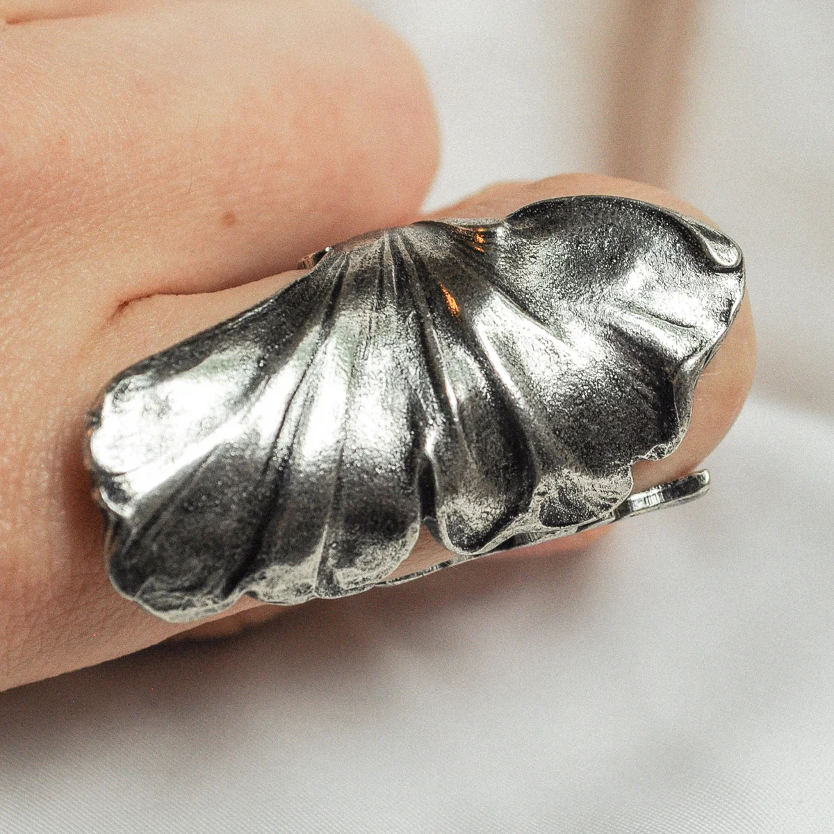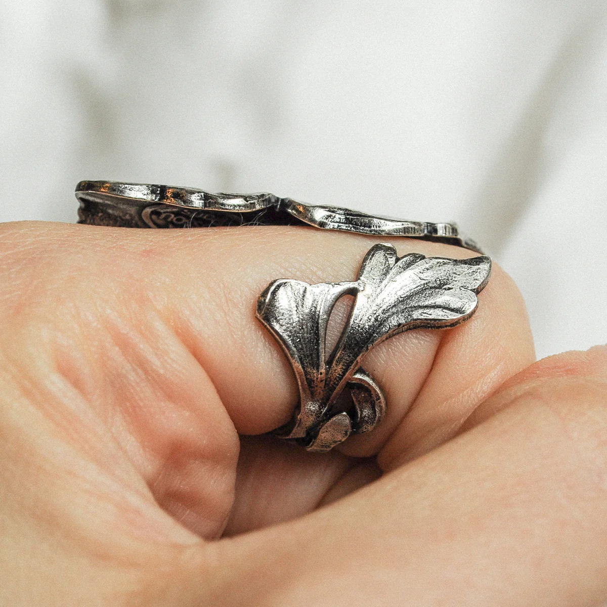 – Bague feuille de Ginkgo en laiton argentée, patinée