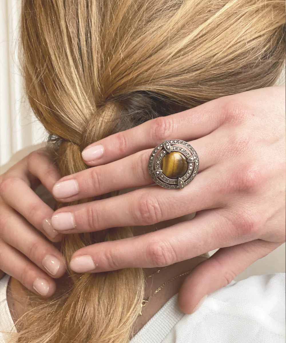 Bague oeil de tigre art déco ronde en argent et marcassites