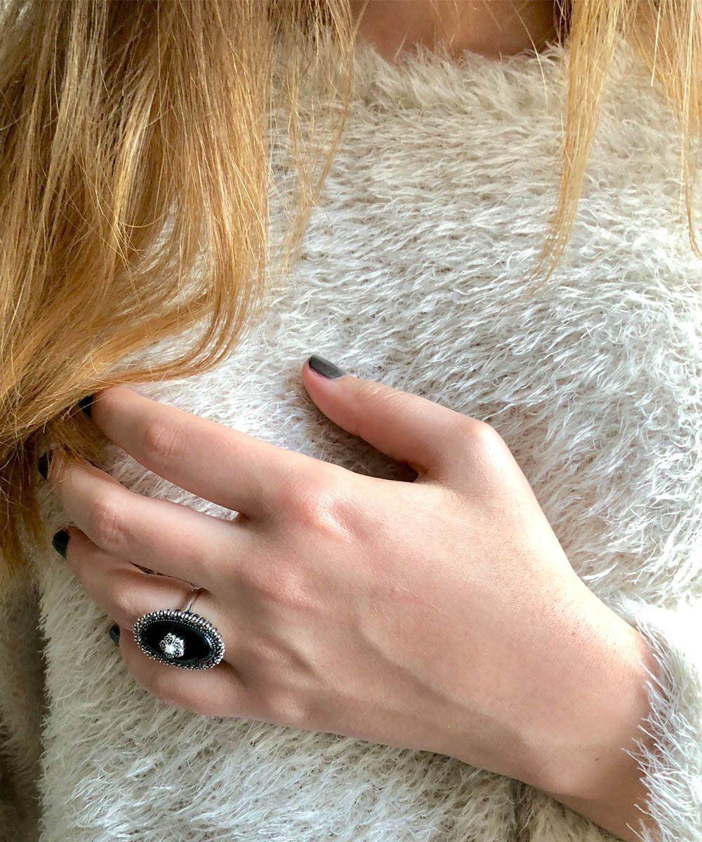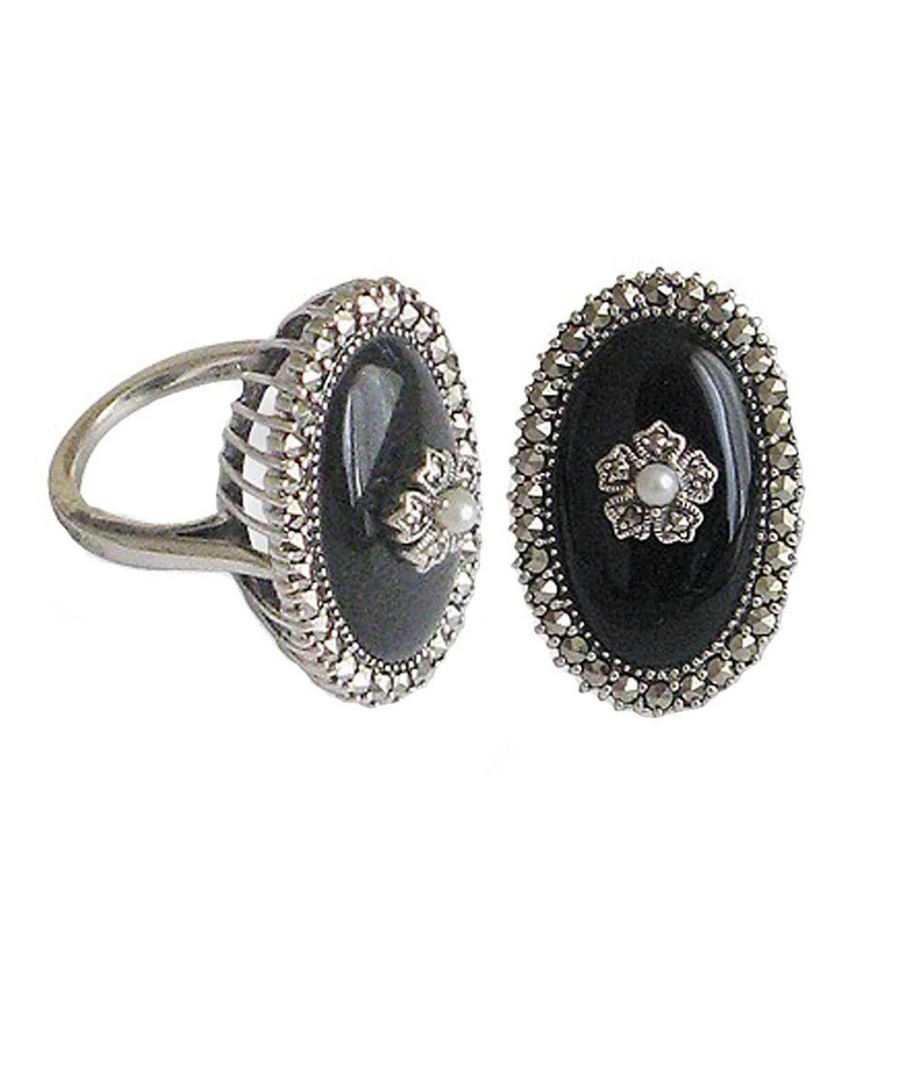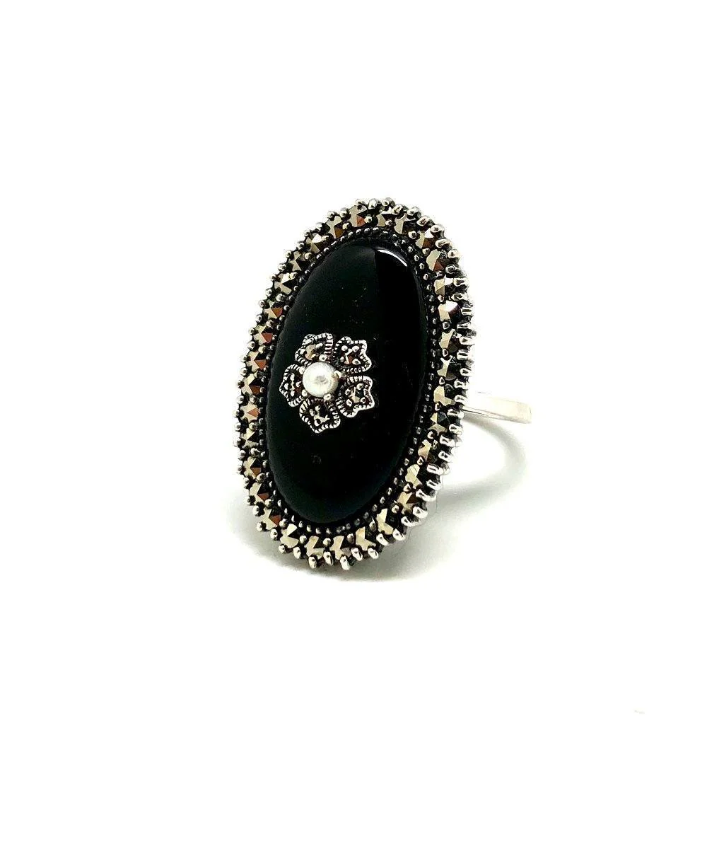 Bague onyx véritable et marcassite sur argent 925, par le créateur Metron.