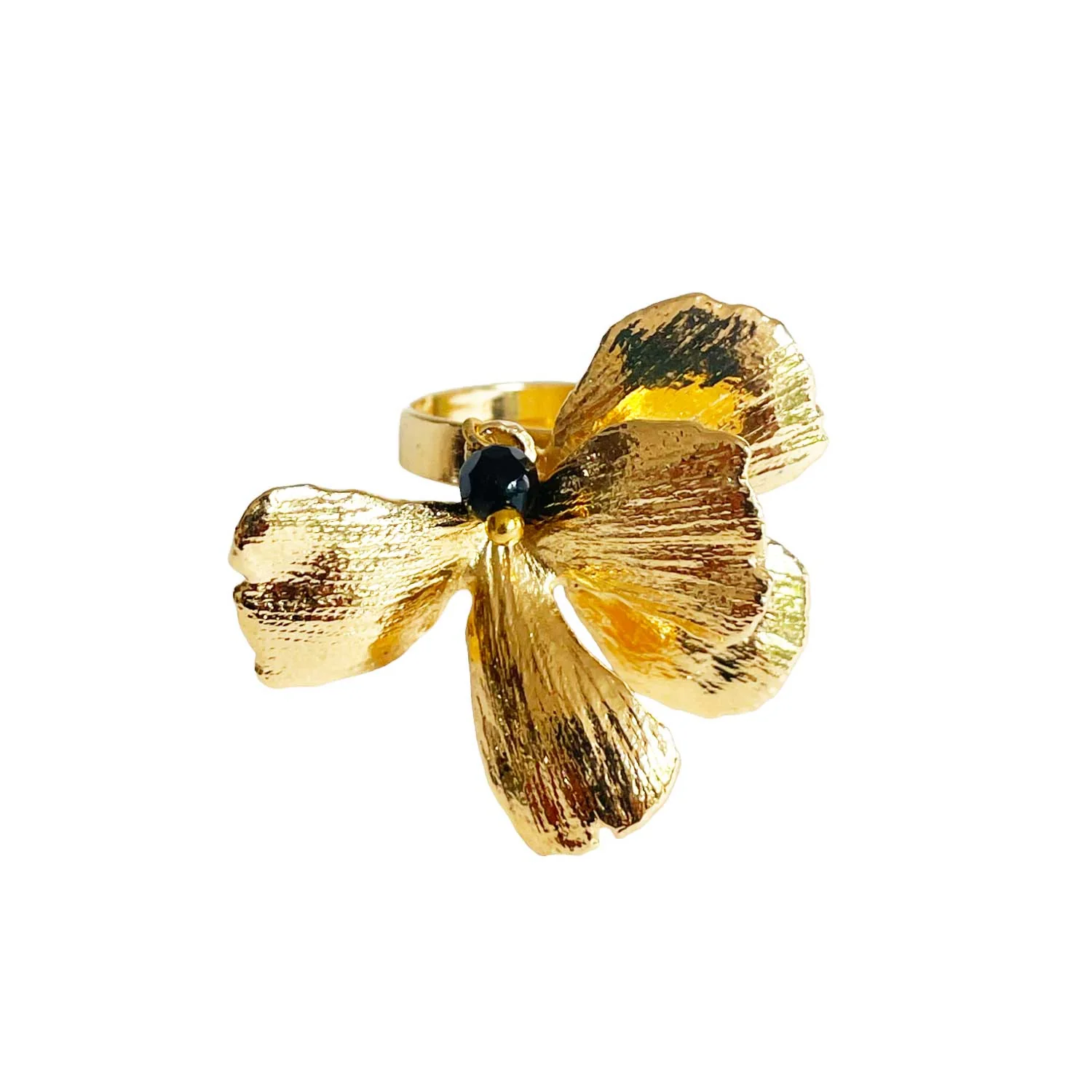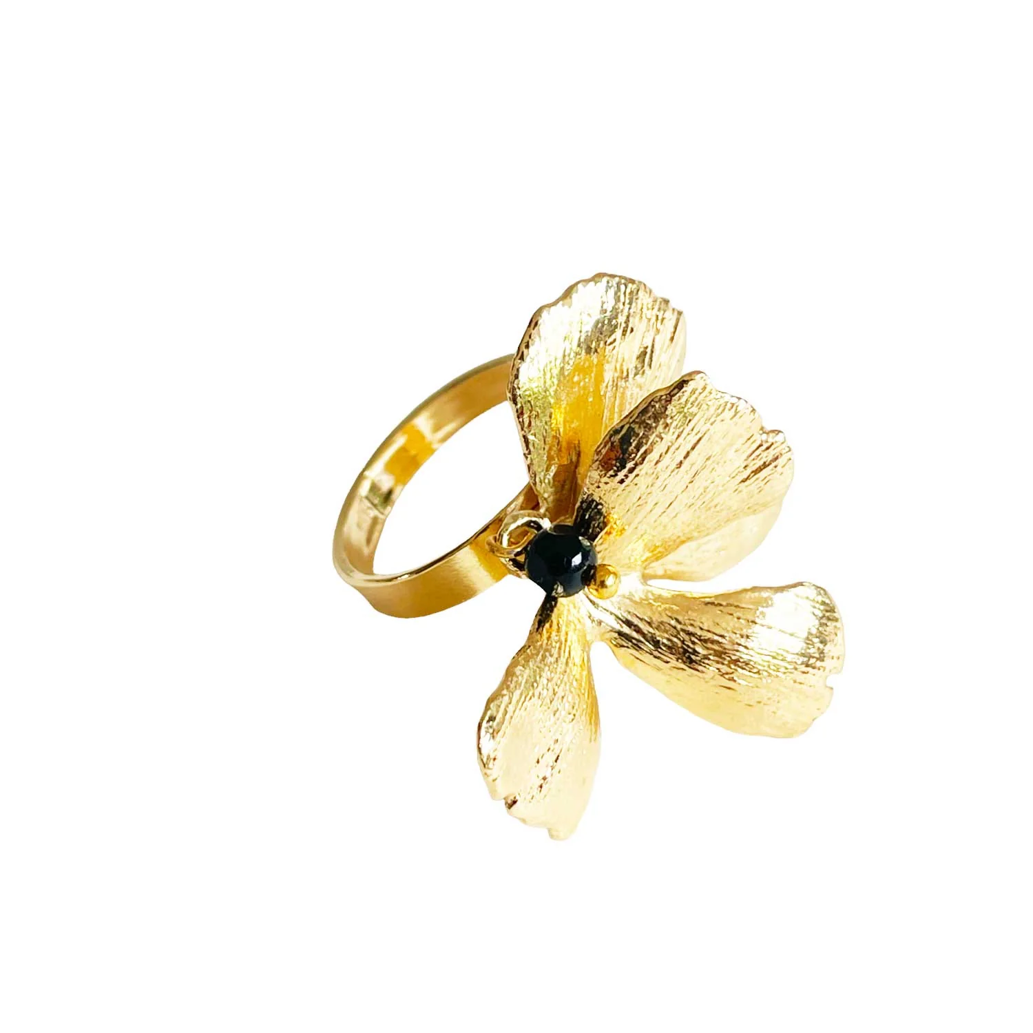 Bague Pansy Dorée Cette bague pansy marquera les esprits par son originalité. -Bague dorée or fin, patinée – Bague ajustable -Pierre fine: Onyx – Sans Nickel – Livré avec une pochette tissée main