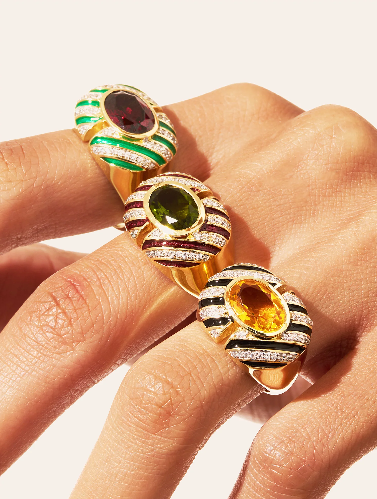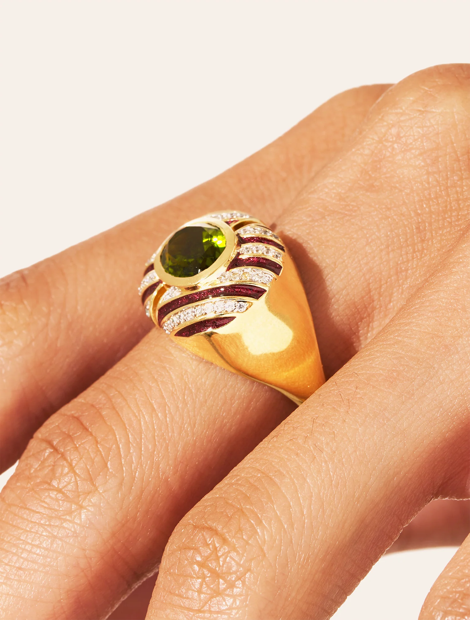 Sculptée en laiton doré à l’or fin 18K, la Bague Zèbre allie élégance et modernité grâce à ses rayures alternées et son zircon vert central. L’émail bordeaux met en valeur la géométrie ajourée, offrant un bijou graphique et lumineux qui attire le regard.