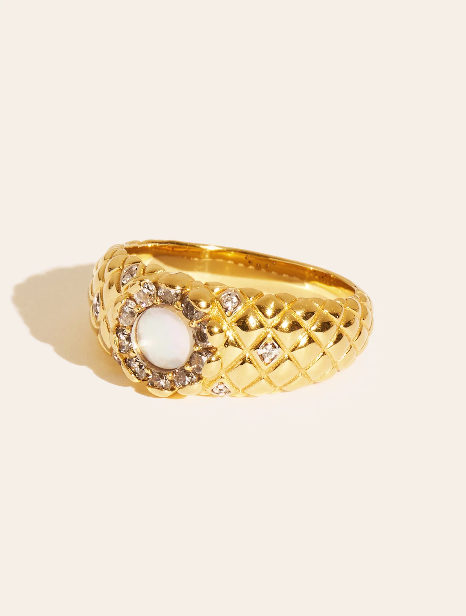 La bague texturée Rive d’Or en Nacre incarne la fusion parfaite entre matière et lumière, entre structure et fluidité. Confectionnée entièrement à la main, cette création facettée mêle dorure et texture sur l’ensemble de sa silhouette. Au centre, une pierre ronde déploie ses reflets et s’entoure d’une constellation de zircons étincelants.