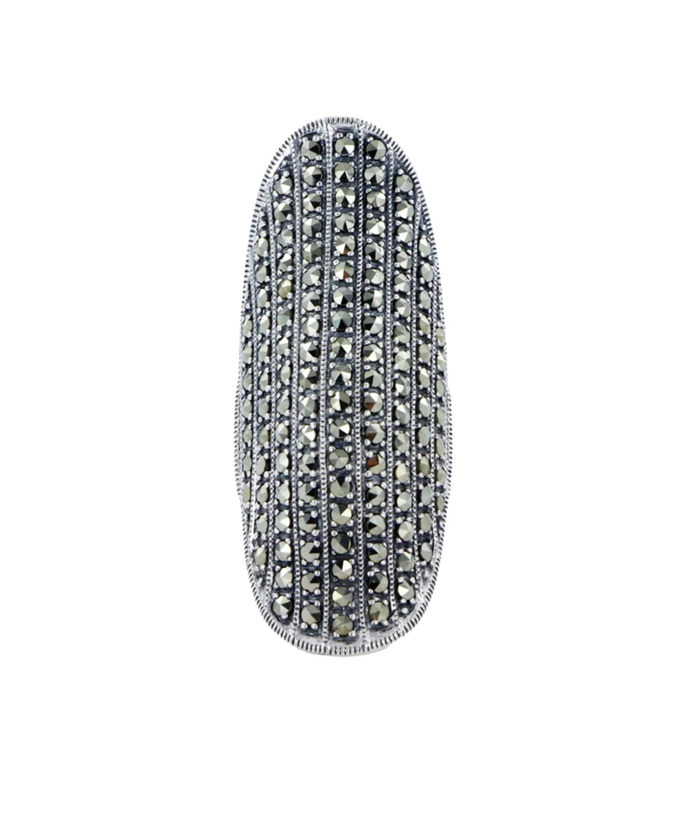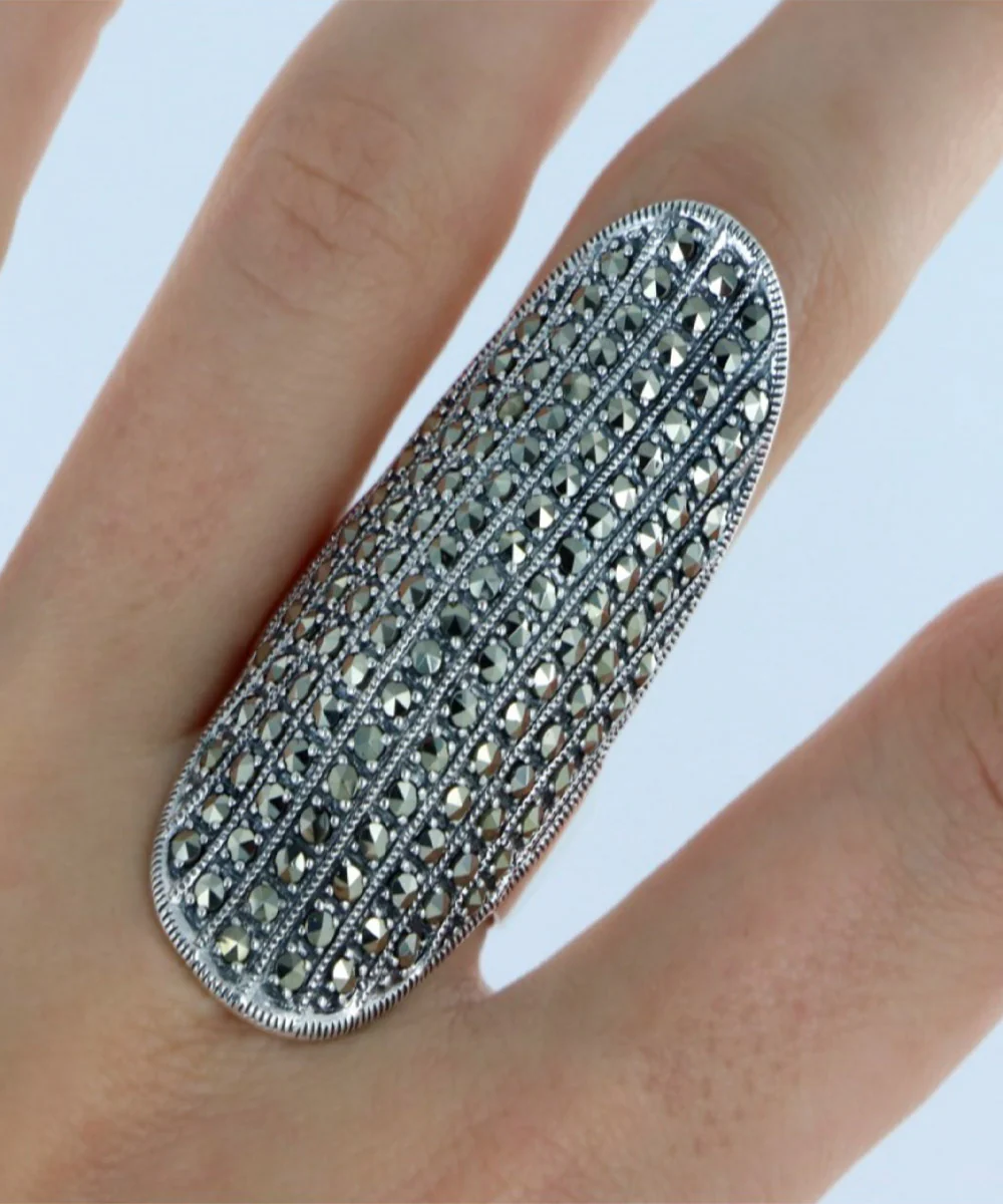 La Marcassite est une pierre minérale, provenant du cristal de pyrite, utilisé pour valoriser une autre pierre, notamment sur des montures en argent. Les marcassites sont taillées de forme ronde ou carrée et serties pour former un pavage qui resplendit comme des petits diamants.
