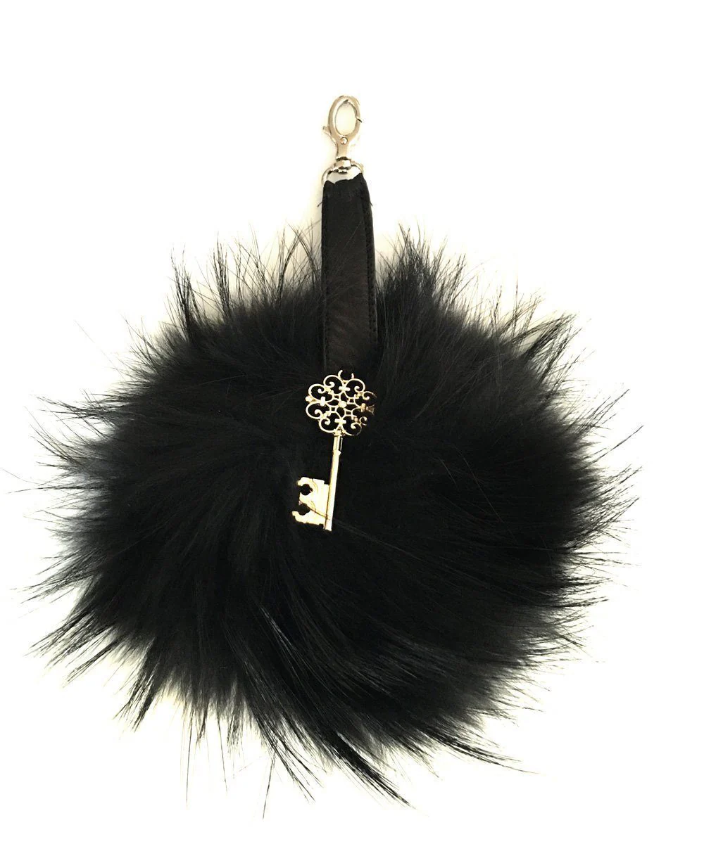 Grand Bijou de sac pompon de grande taille en fourrure de marmotte et cuir noir.