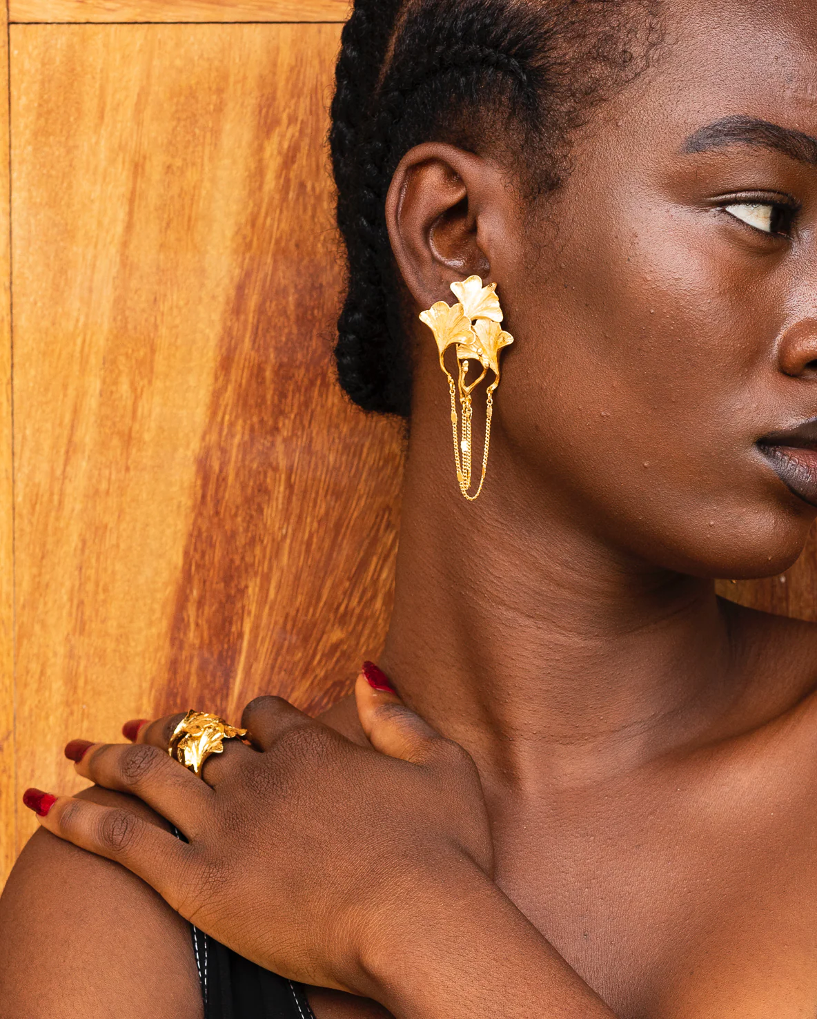 Boucles d’Oreilles Gintao Tika Dorée Trois feuilles de ginkgo dansent avec le vent. Elles murmurent à vos oreilles la promesse du renouveau. – Boucles d’oreilles en laiton doré or fin -Longueur: 6,5 cm – Sans Nickel – Livré avec une pochette tissée main