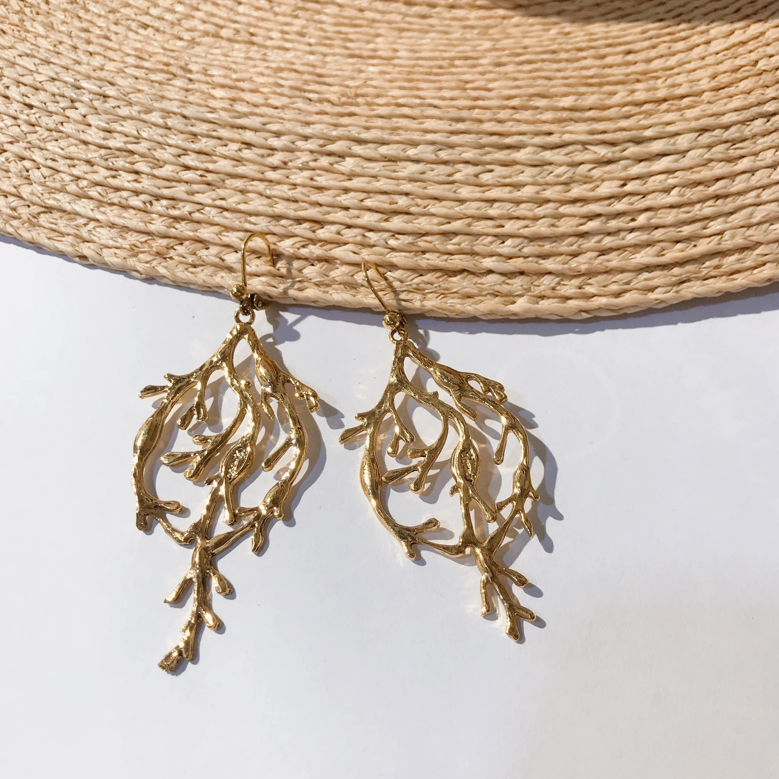 BOUCLES D’OREILLES ALGUE – Boucles d’oreilles dorées or fin, patinées – Inoxydable – Sans Nickel – Livré avec une pochette tissée main