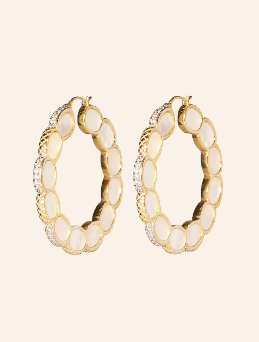 Sublime création, subtile fabrication : la paire de boucles d’oreilles Amara en Nacre laisse sans voix. Si le minutieux cache-cache de zircons dorés et argentés sur les côtés est fabuleux, la présence de fines pierres incrustées dans chaque forme ovale, rappelant celle de beaux pétales, est d’une grande élégance. Sans conteste, l’allure intemporelle et originale de ces créoles font d’elle une merveille.