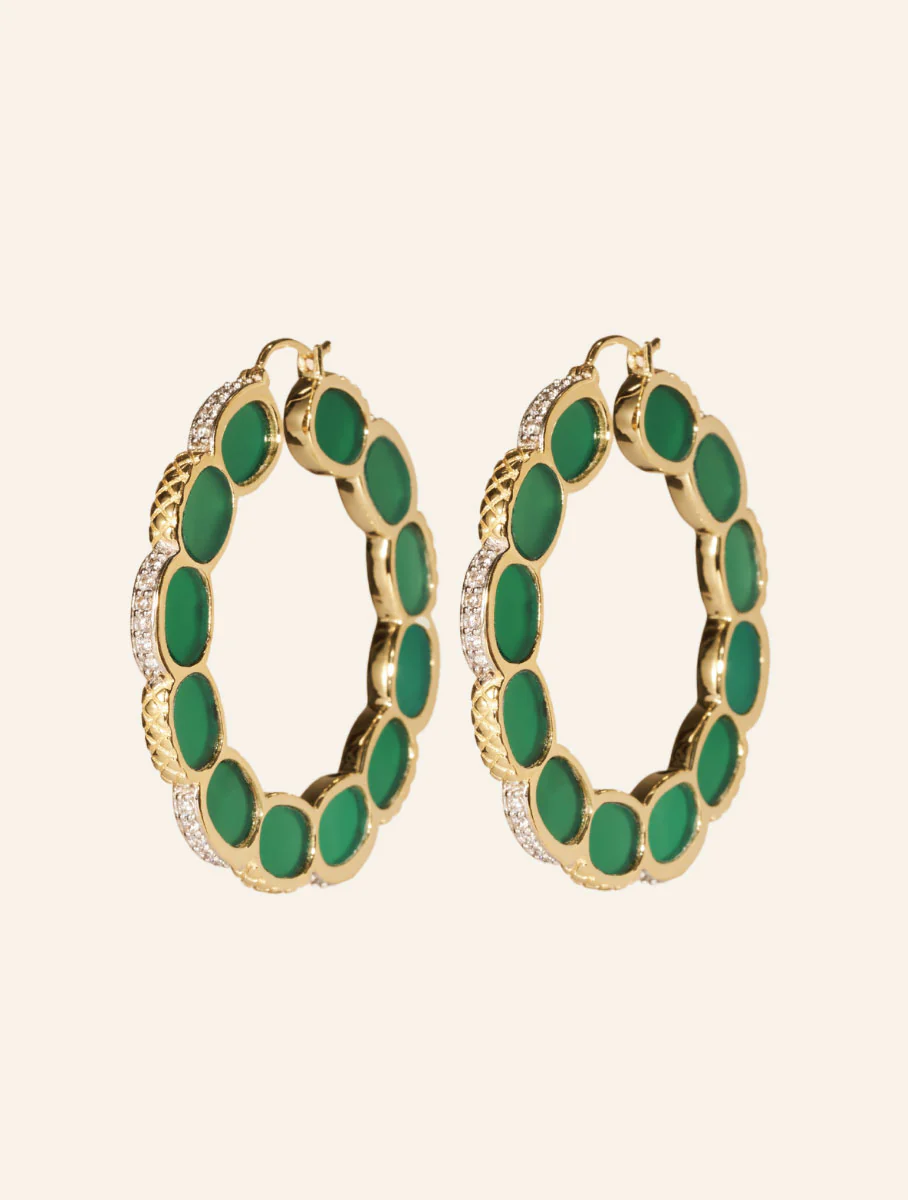 Sublime création, subtile fabrication : la paire de boucles d’oreilles Amara en Onyx Vert laisse sans voix. Si le minutieux cache-cache de zircons dorés et argentés sur les côtés est fabuleux, la présence de fines pierres incrustées dans chaque forme ovale, rappelant celle de beaux pétales, est d’une grande élégance. Sans conteste, l’allure intemporelle et originale de ces créoles font d’elle une merveille.