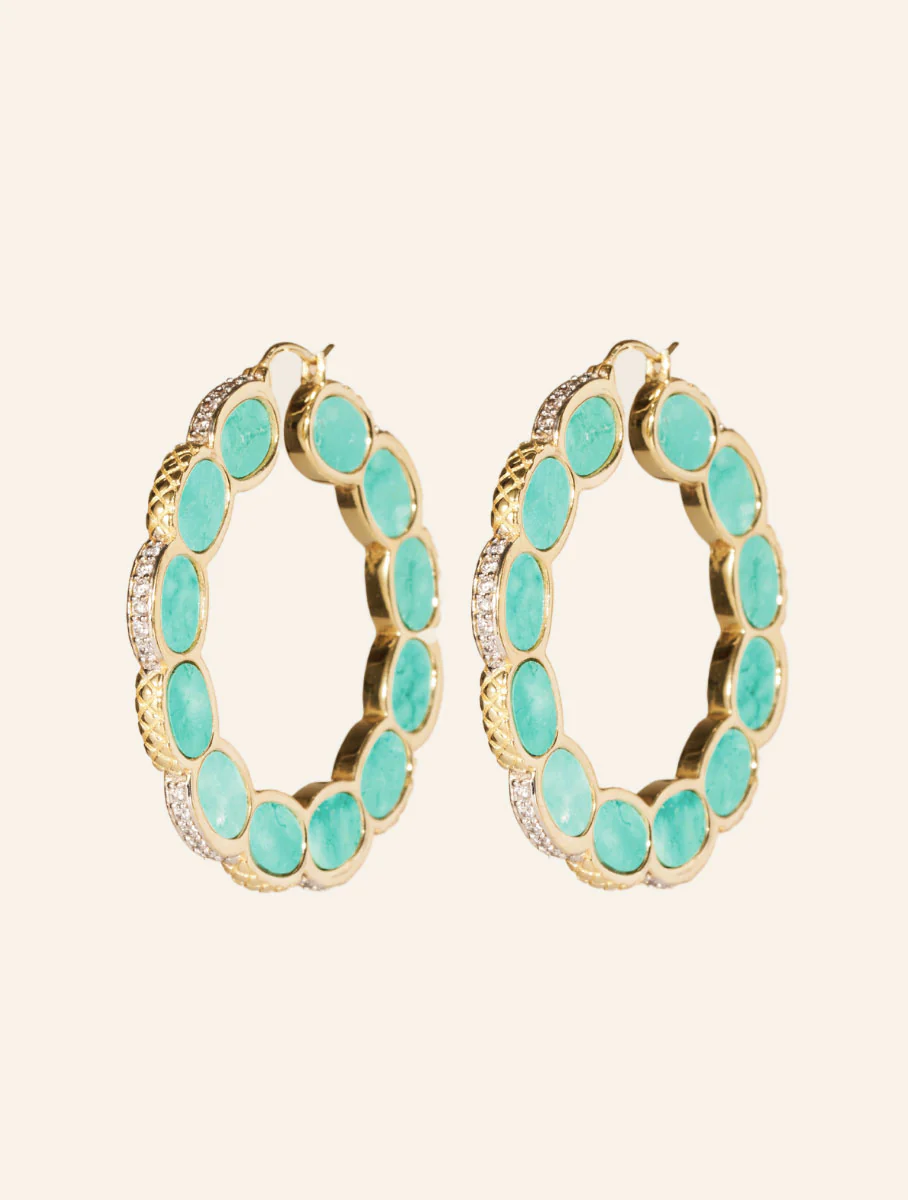Sublime création, subtile fabrication : la paire de boucles d’oreilles Amara en Turquoise laisse sans voix. Si le minutieux cache-cache de zircons dorés et argentés sur les côtés est fabuleux, la présence de fines pierres incrustées dans chaque forme ovale, rappelant celle de beaux pétales, est d’une grande élégance. Sans conteste, l’allure intemporelle et originale de ces créoles font d’elle une merveille.