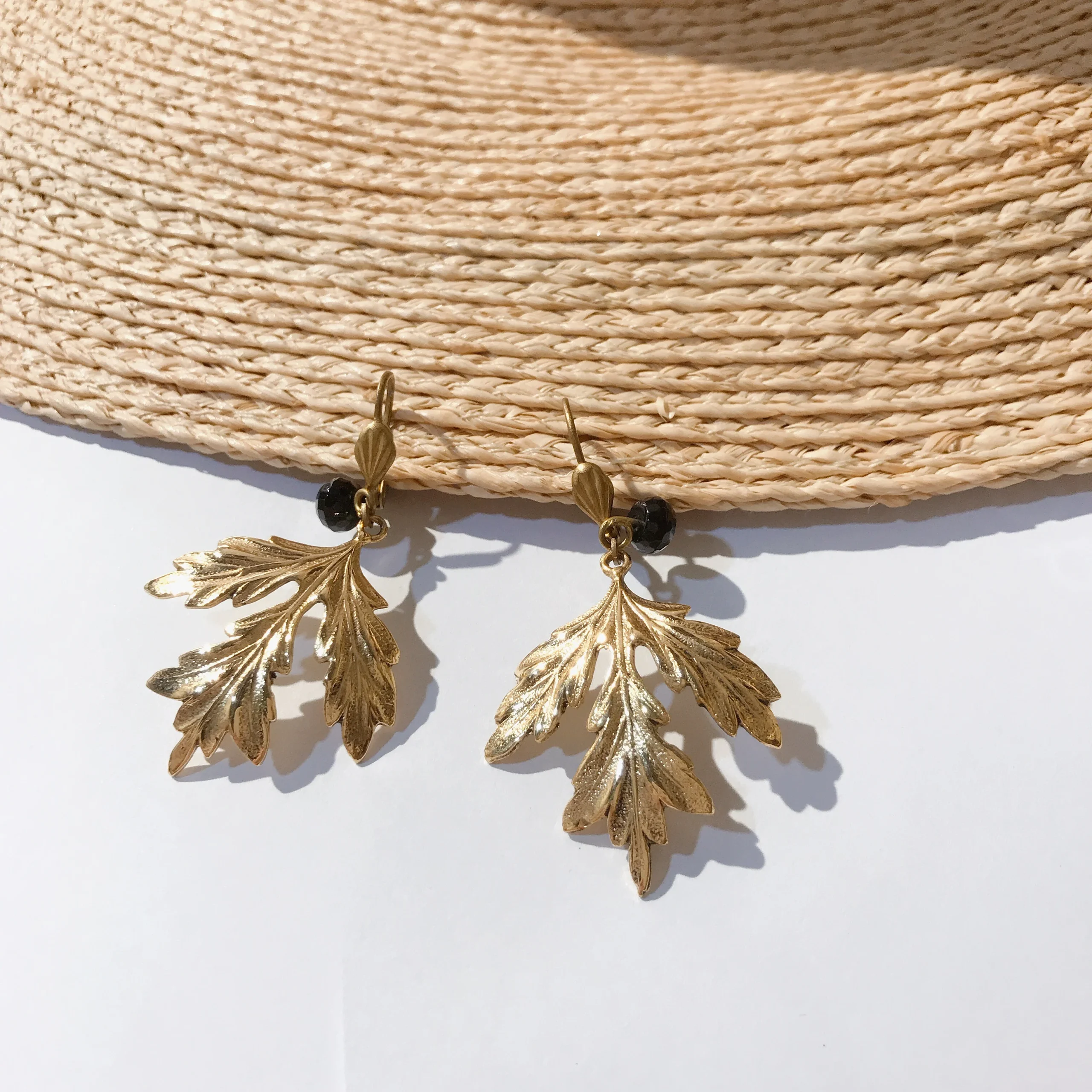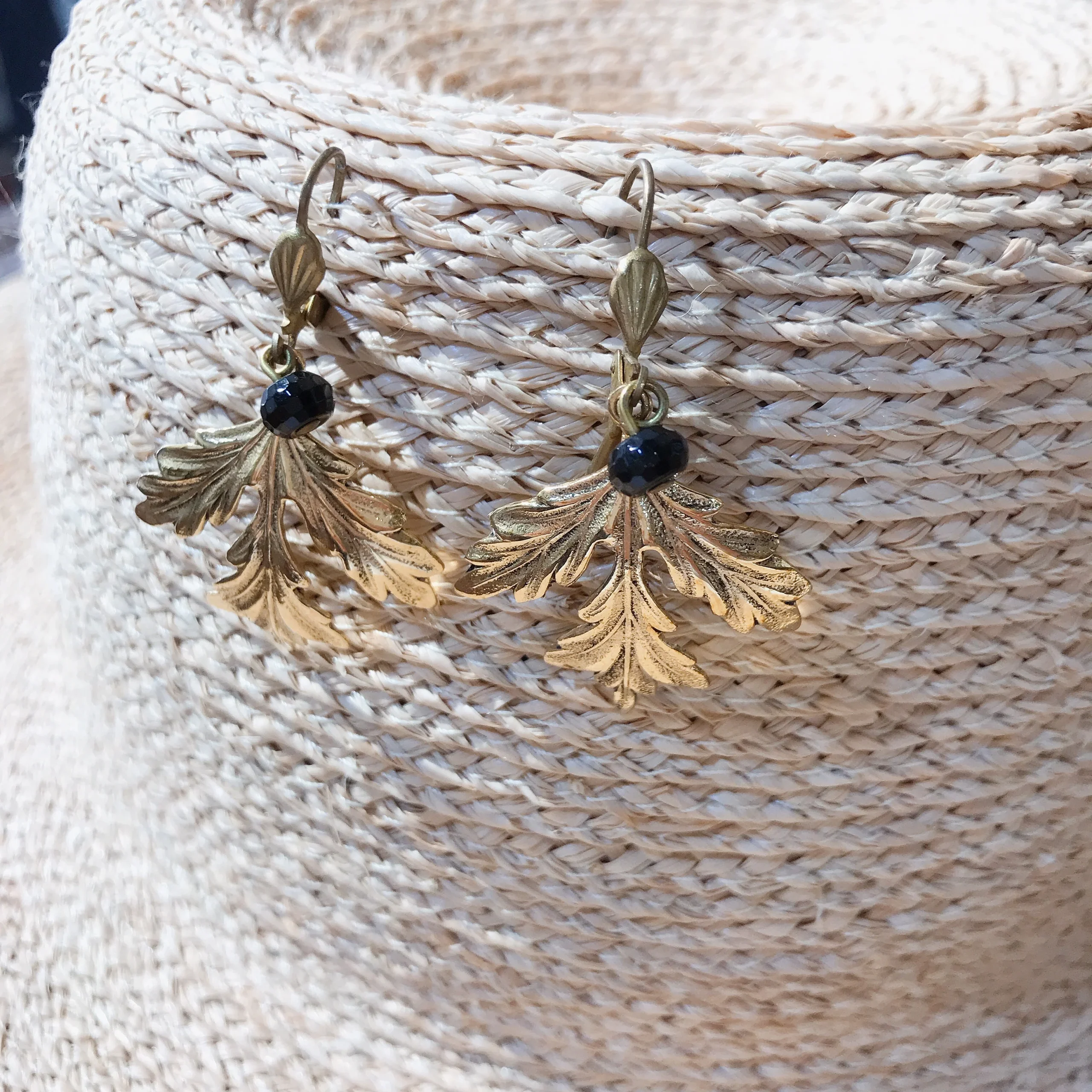 Boucles d’Oreilles Ella Dorées – Boucles d’oreilles dorées or fin, patinées – Pierres: Onyx – Inoxydable – Sans Nickel – Livré avec une pochette tissée main