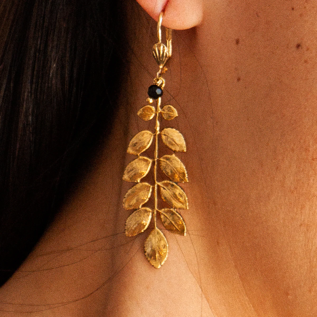 Boucles d’oreilles Feuille d’Acacia Dorées – Boucles d’oreilles dorées or fin, patinées – Pierres: Onyx ( facultatif ) – Inoxydable – Sans Nickel – Livré avec une pochette tissée main
