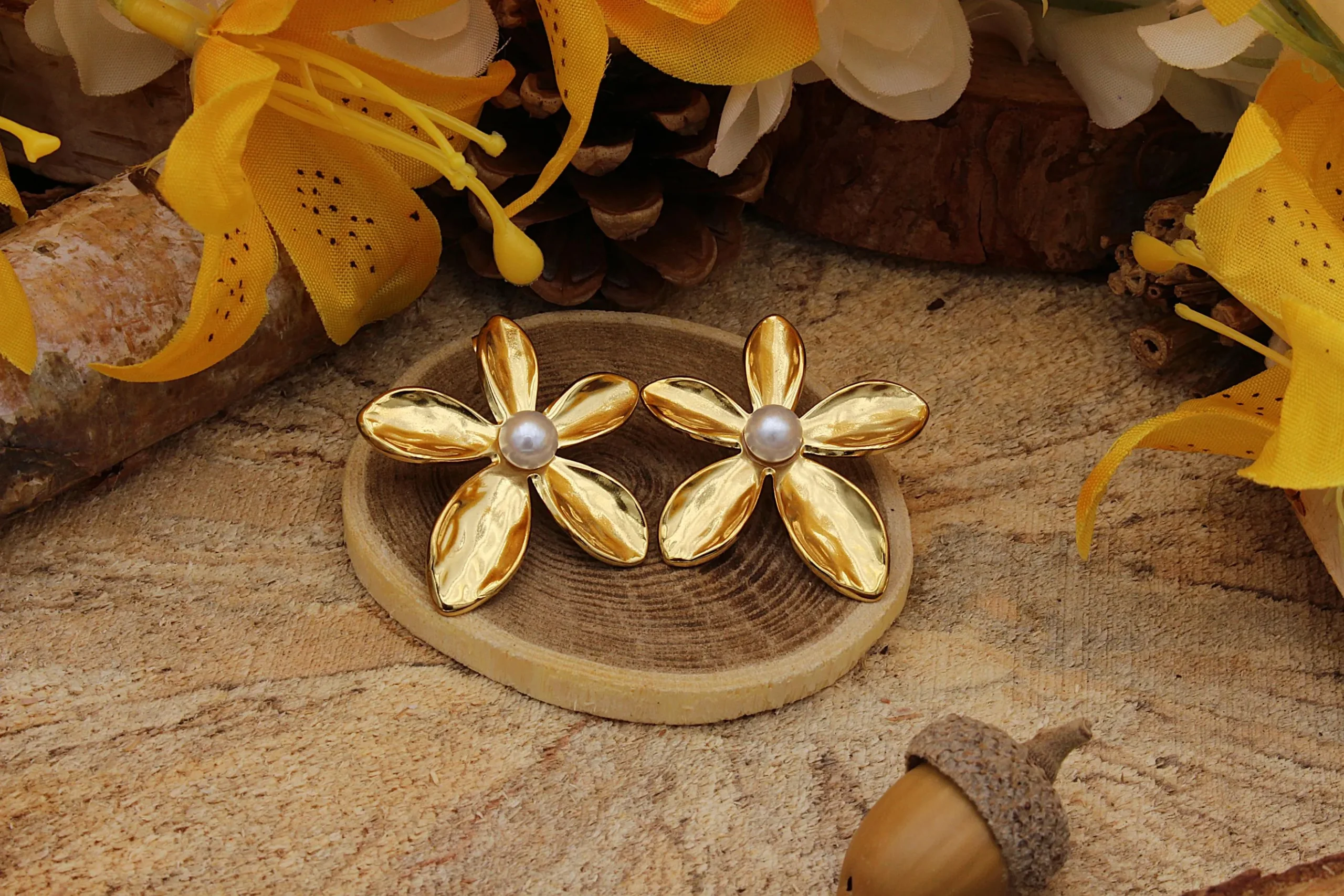 Bijoux Clous d’Oreilles Fleur-Evasée-Perle en acier inoxydable 316.