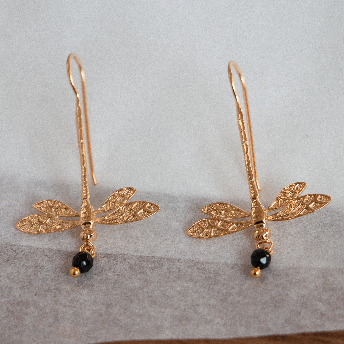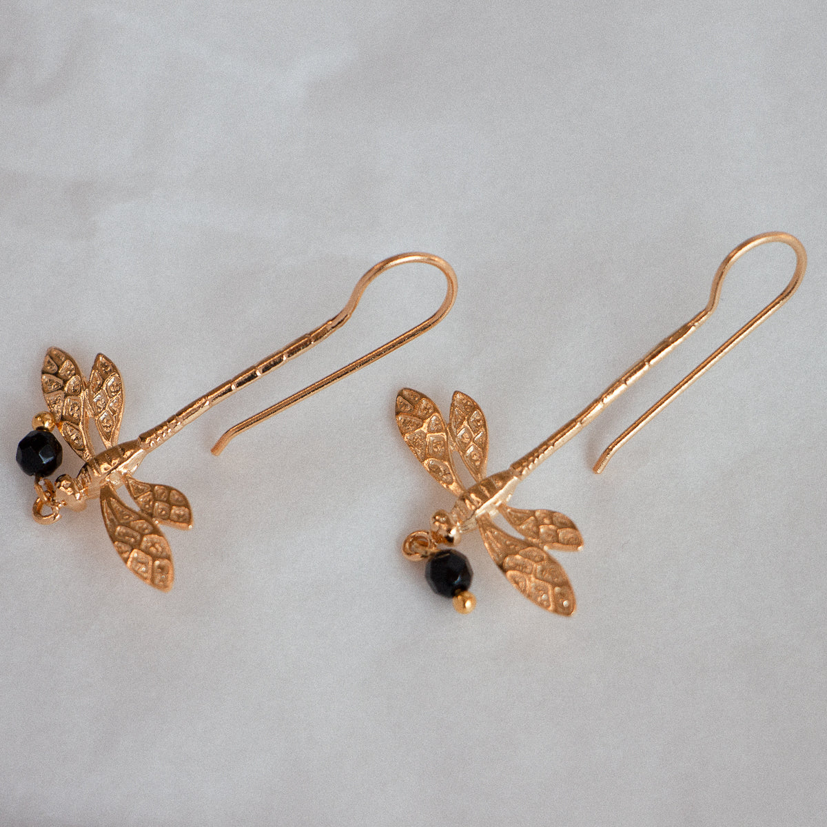 Boucles d’Oreilles Libellule Onyx Dorées