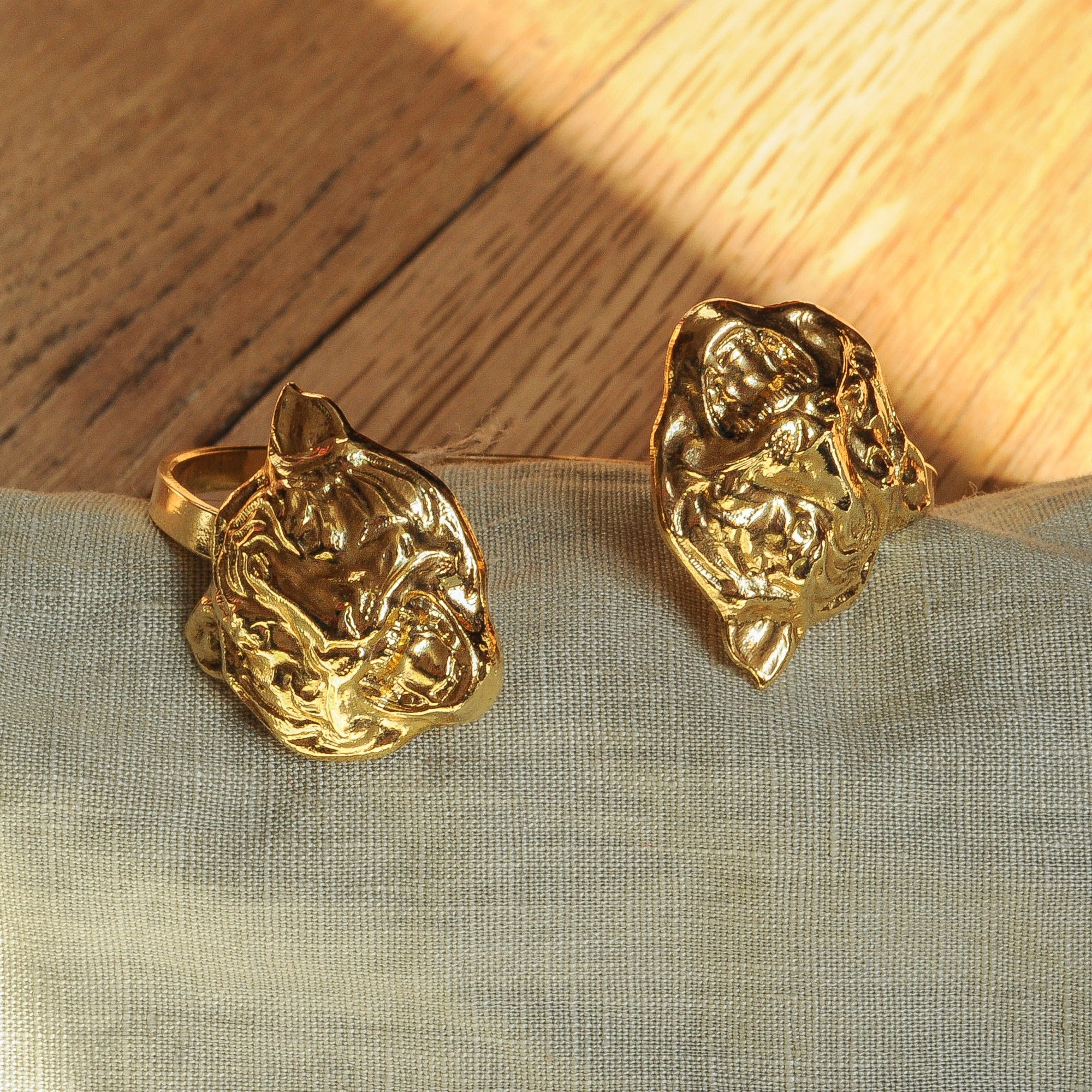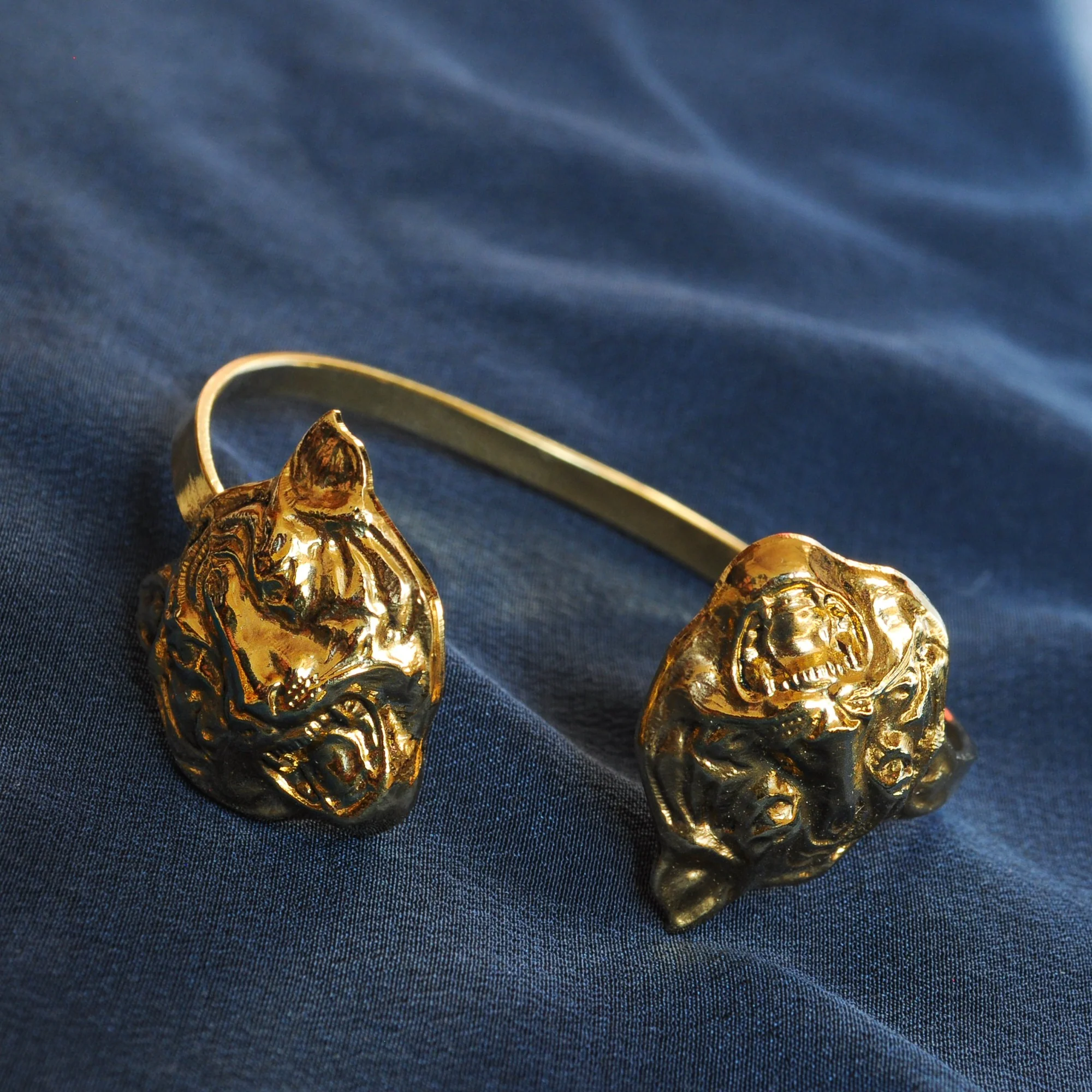 Bracelet Tigre Doré Ces deux tigres sont enroulés à votre poignet comme un serment de puissance intérieure. Un bijou pour celles qui avancent avec grâce et détermination. – Bracelet double tête de tigre en laiton doré or fin – Bracelet ajustable – Sans Nickel – Livré avec une pochette tissée main