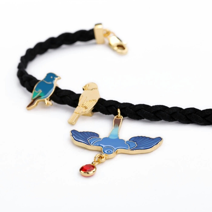 Bracelet fantaisie oiseaux. Bracelet en cuir noir. Pendentif oiseau émaillé. Ajustable – Convient à tous les poignets même les plus petites.