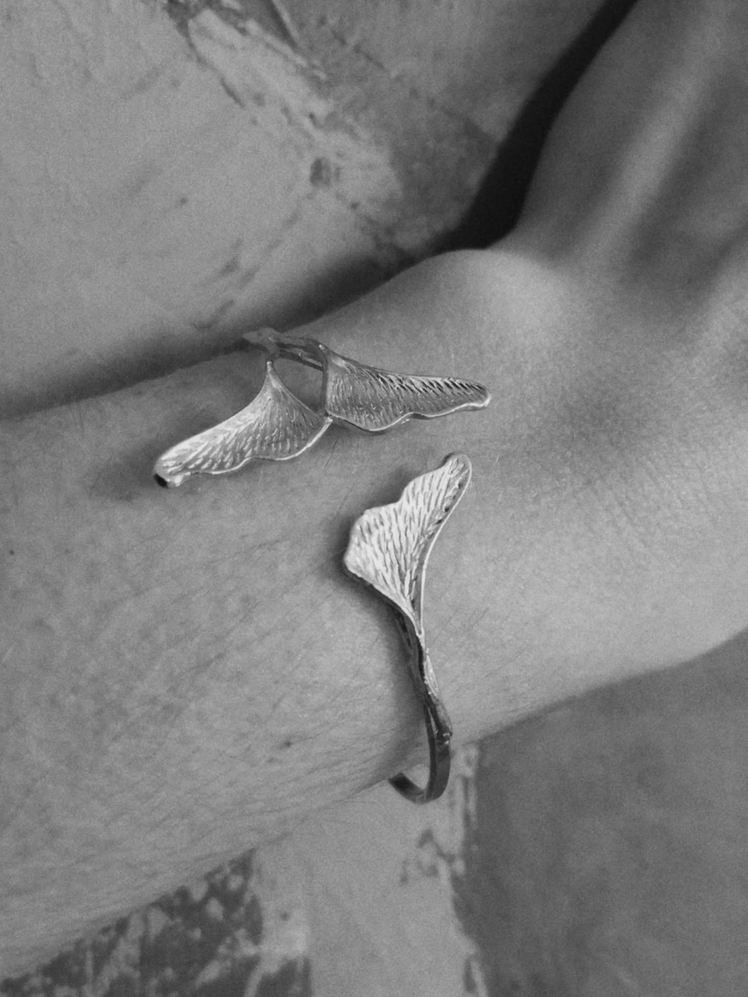 Bracelet Petit Ginkgo fin et délicat. Facile à porter au quotidien, il s’adaptera à toutes les occasions. À votre poignet, la feuille de ginkgo devient une caresse végétale, douce et forte à la fois.