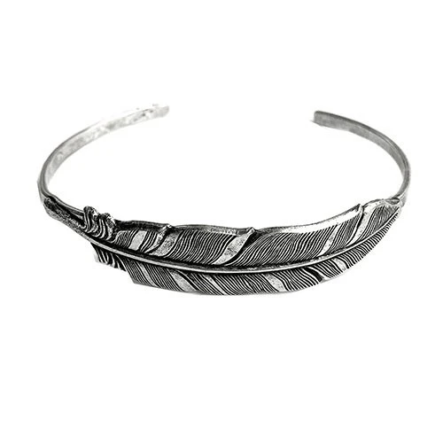 BRACELET PLUME – Bracelet argenté, patiné – Bracelet ajustable – Sans Nickel – Inoxydable – Livré avec une pochette tissée main