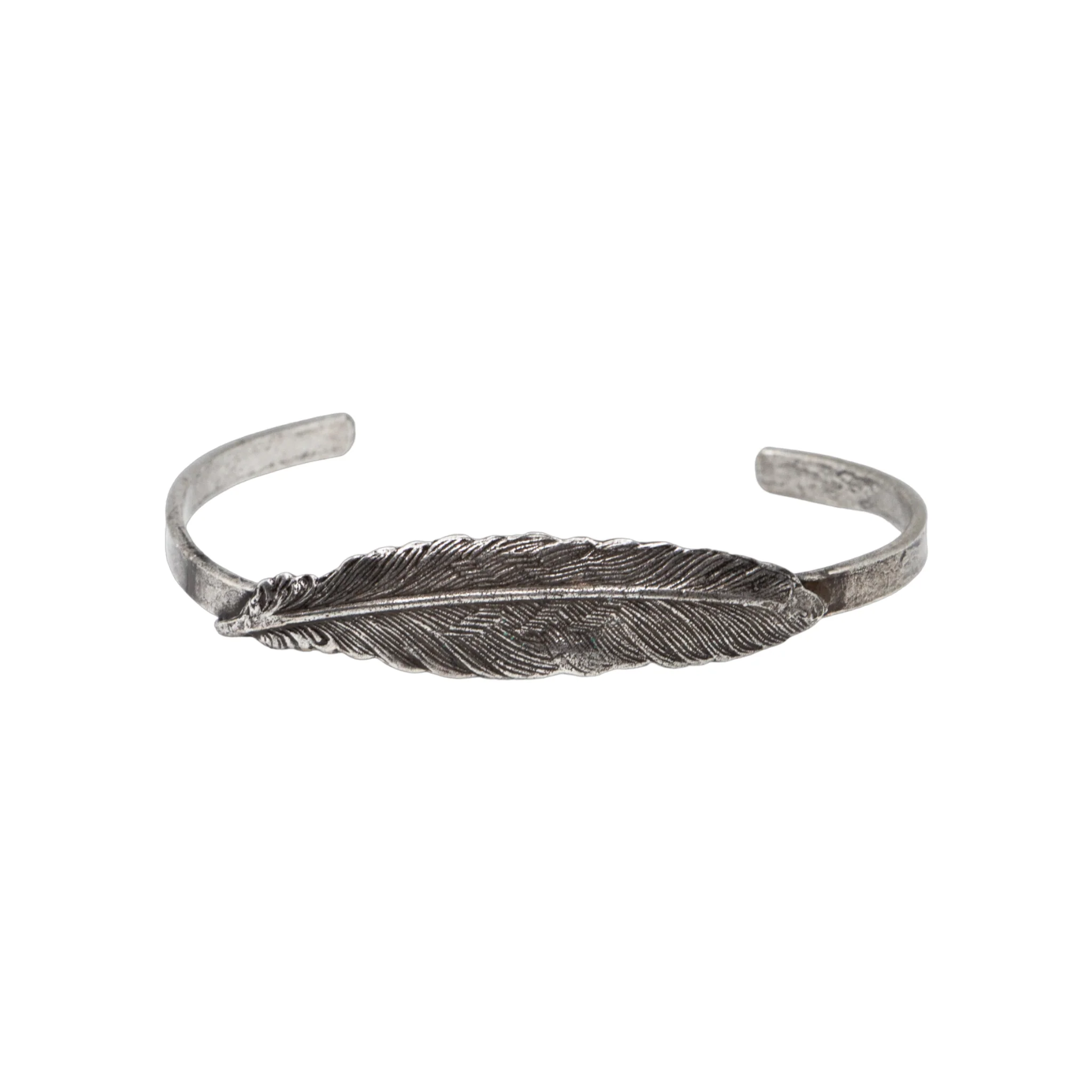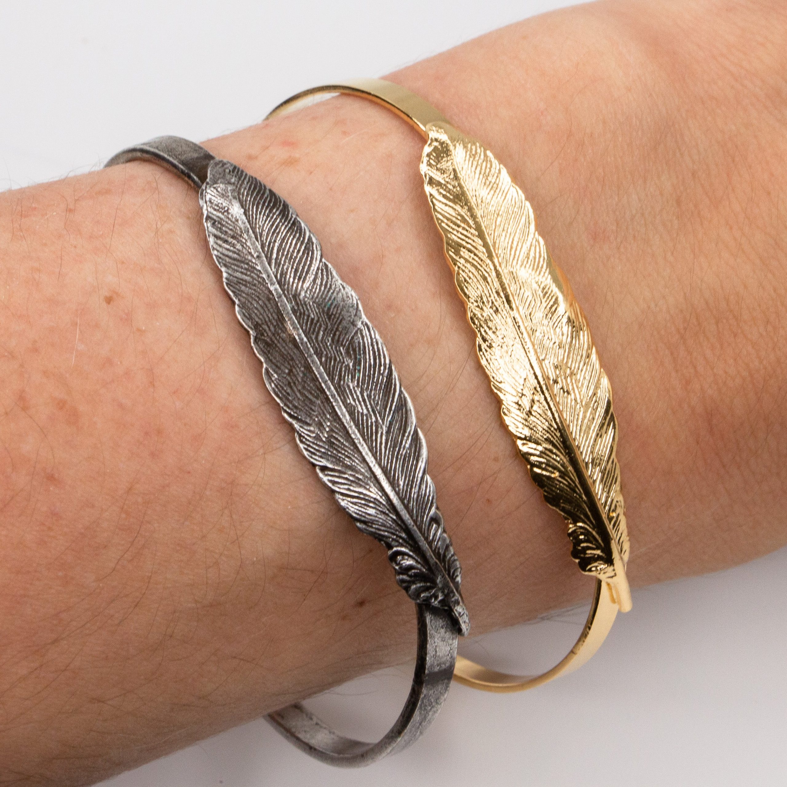 BRACELET PLUME – Bracelet en laiton argenté et patiné – Bracelet ajustable – Sans Nickel – Livré avec une pochette tissée main