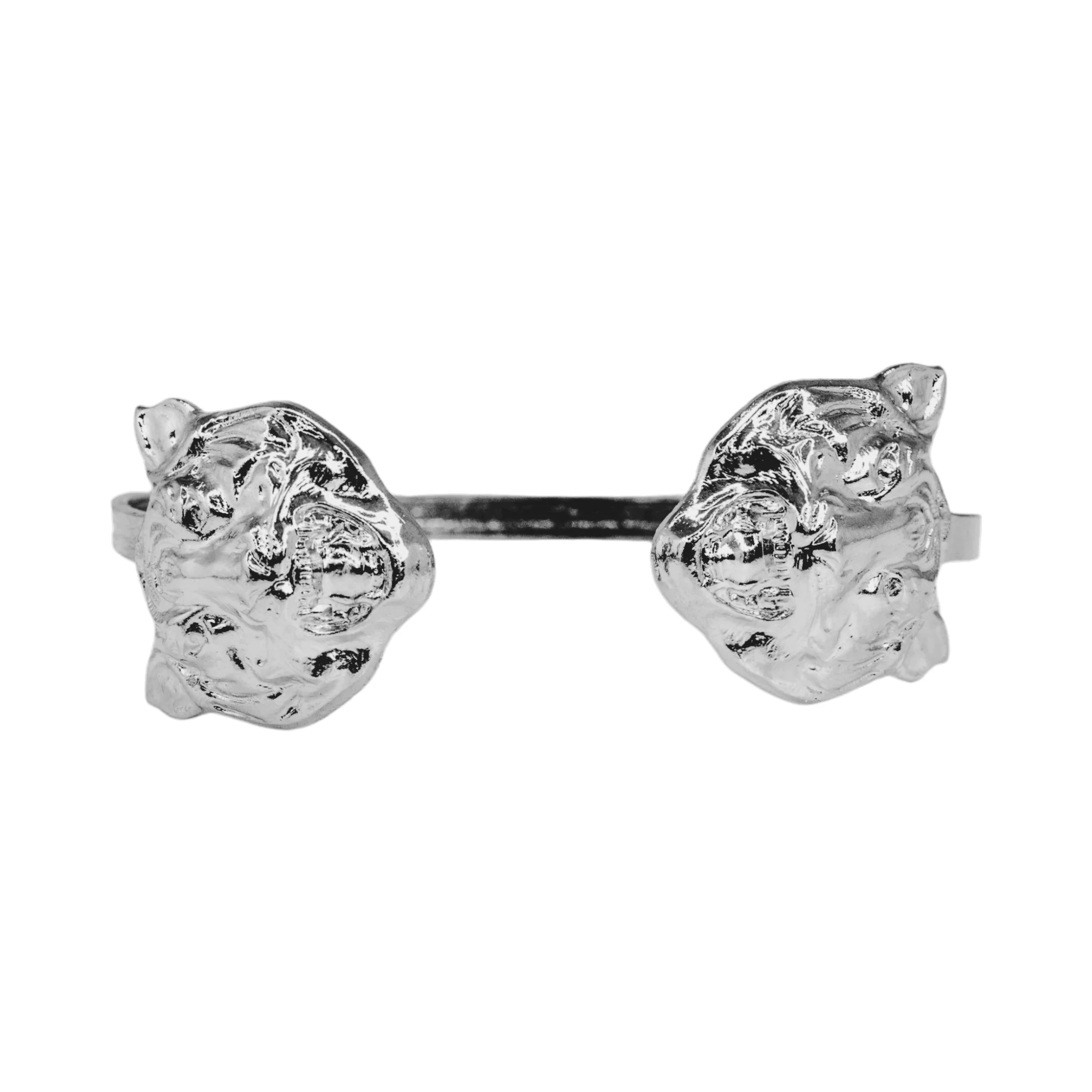 Bracelet Tigre Argenté Ces deux tigres sont enroulés à votre poignet comme un serment de puissance intérieure. Un bijou pour celles qui avancent avec grâce et détermination. – Bracelet double tête de tigre en laiton argenté et vieilli – Bracelet ajustable – Sans Nickel – Livré avec une pochette tissée main