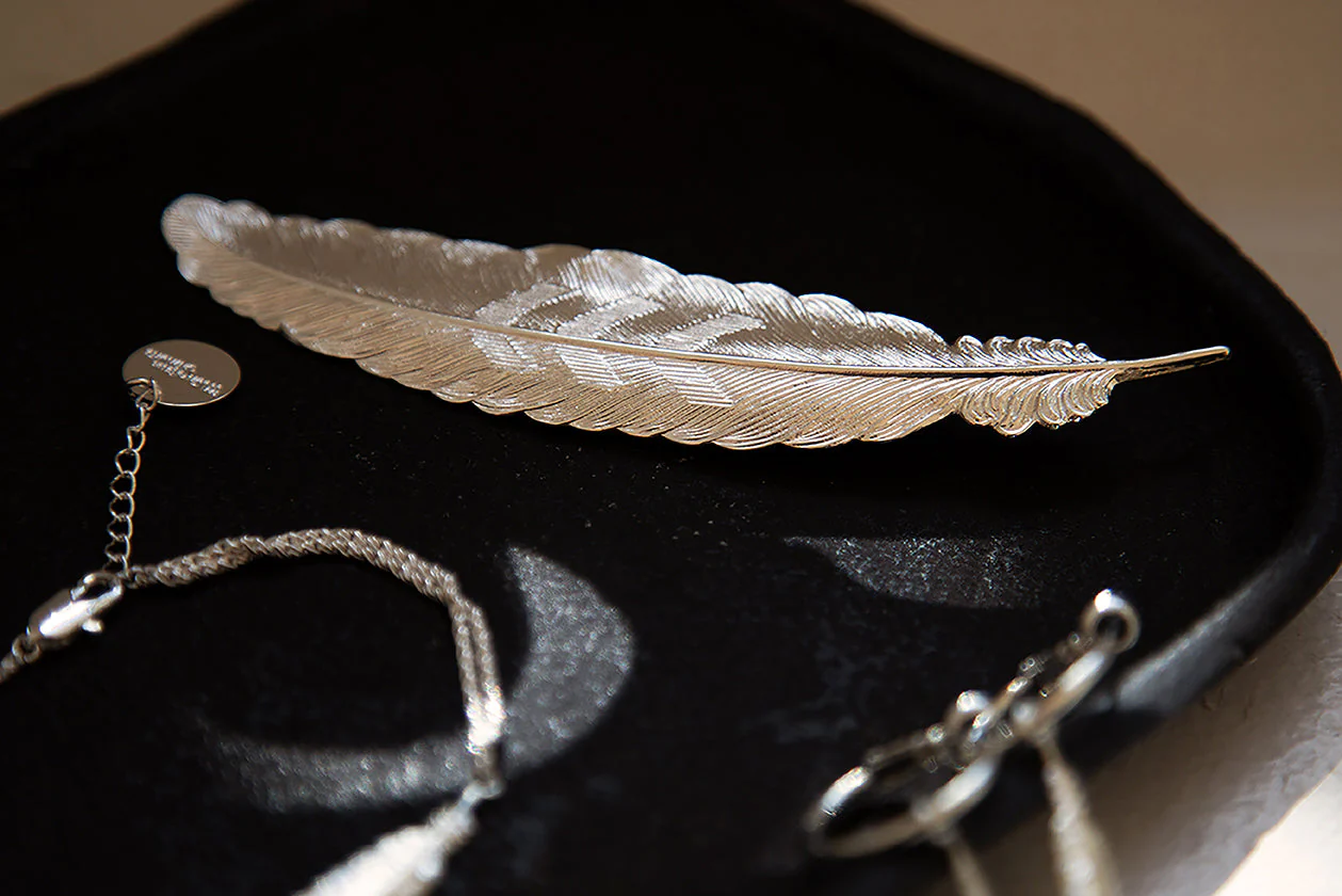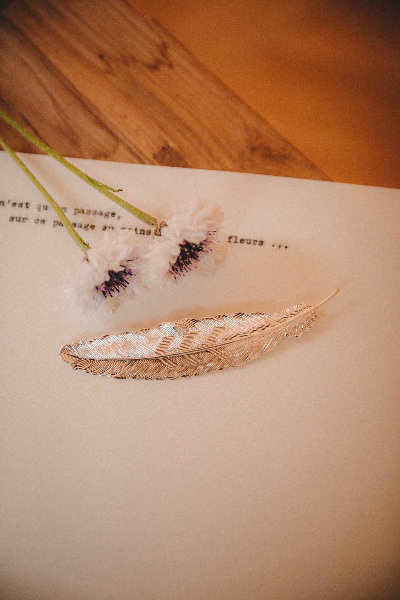 Broche Phébé en laiton plaqué argent – longueur 11,5 cm – avec une plume.