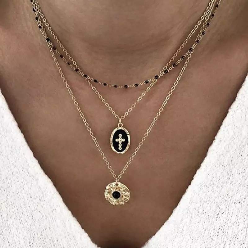 collier 3 rangs médaille émaillée Collier multirangs en metal plaqué or. Pendentifs : Médaille martelée et médaille émaillée noire Réglable: 35cm -40cm -45cm Ce collier multirangs est le cadeau idéal à offrir à une femme.