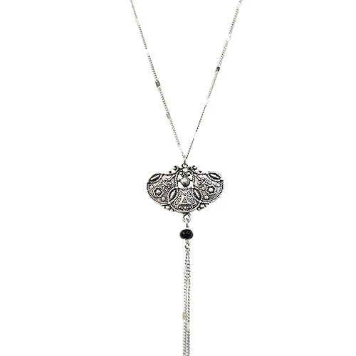 Collier Antique – Collier argenté, patiné – Pierre fine: Onyx – Longueur: 40cm – Inoxydable – Sans Nickel – Livré avec une pochette tissée main