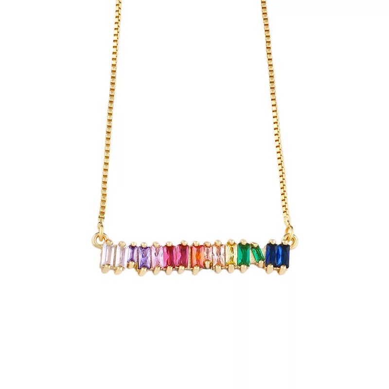 Collier arc en ciel – barre. Ce collier arc en ciel avec pendentif barre sera facile à porter au quotidien. Collier aux couleurs d’un arc-en-ciel en plaqué or. Collier plaqué or: 40 cm + (5 cm de chaine de rallonge ) Pendentif barre: 1,9 cm. On est fan de ce bijou de créateur signé Bijoux by Julie. Emballage cadeau offert