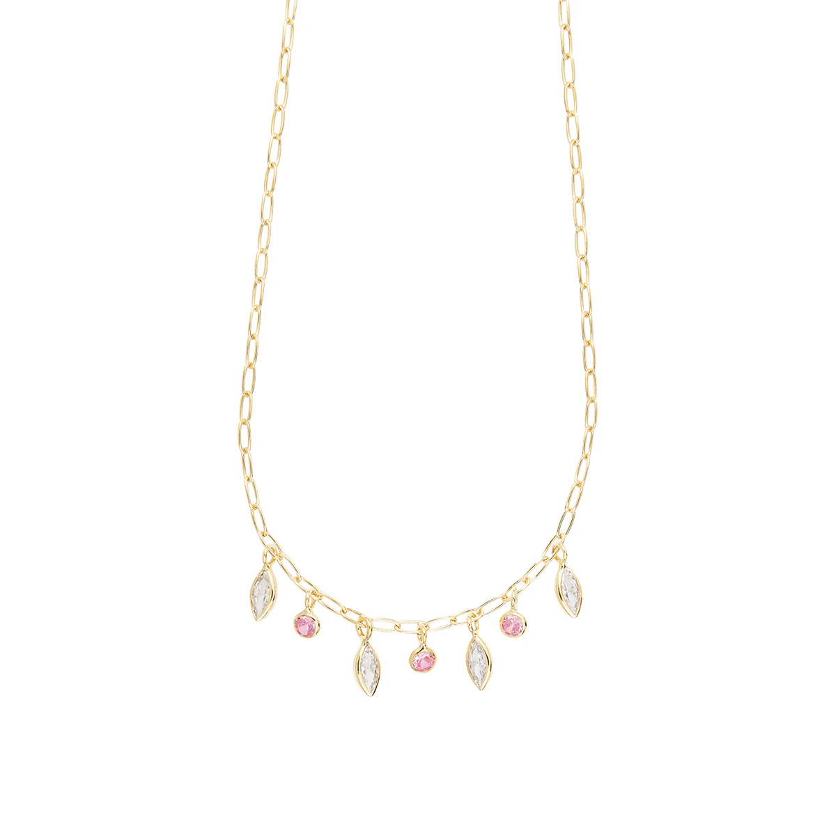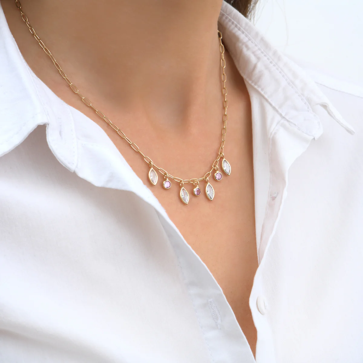 - Matière : Fabriqué en argent massif, ce collier est également orné de cristaux ronds et navettes taillés à facettes, ajoutant une touche de couleur et de brillance.