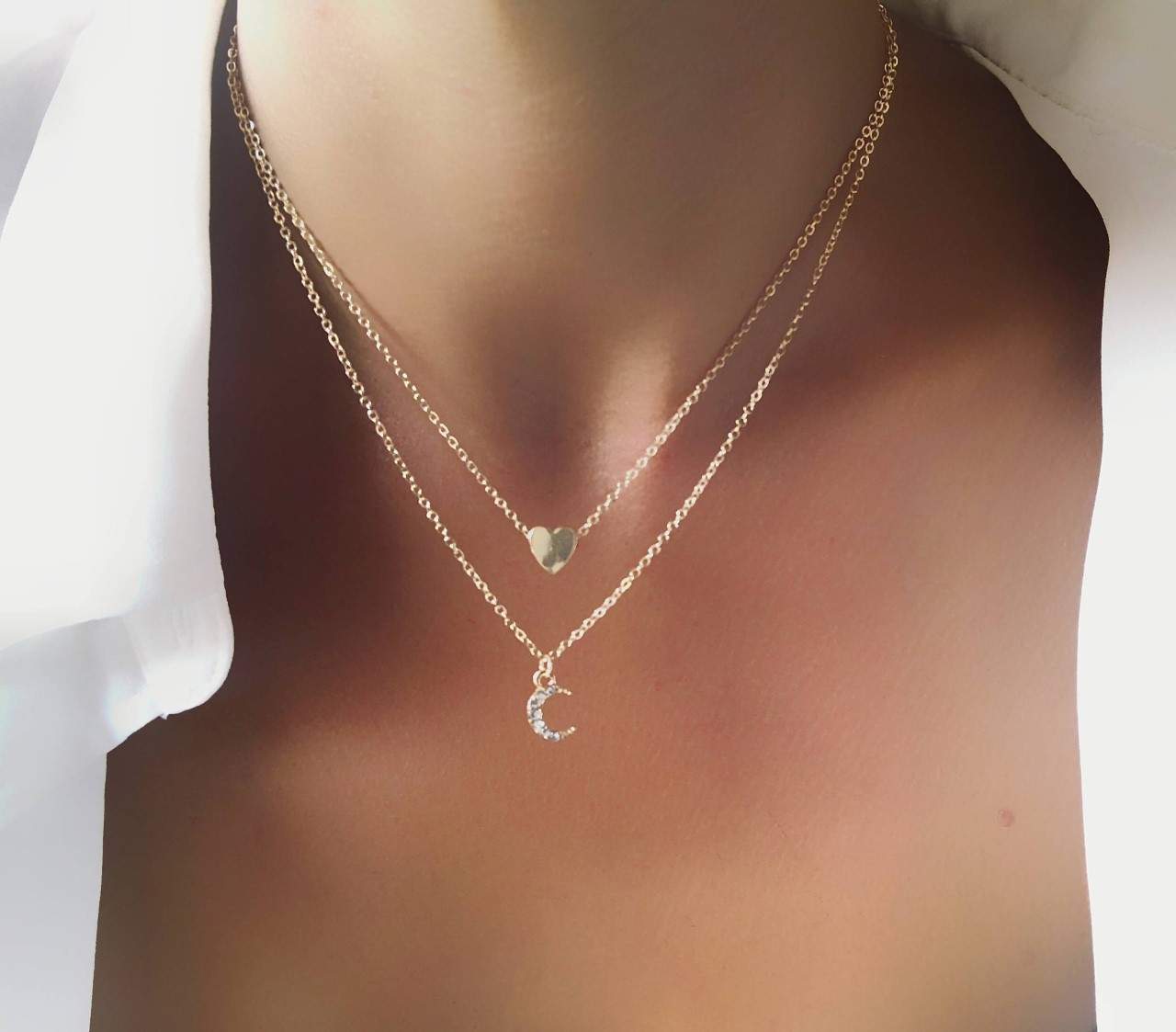Collier double chaine coeur et lune.