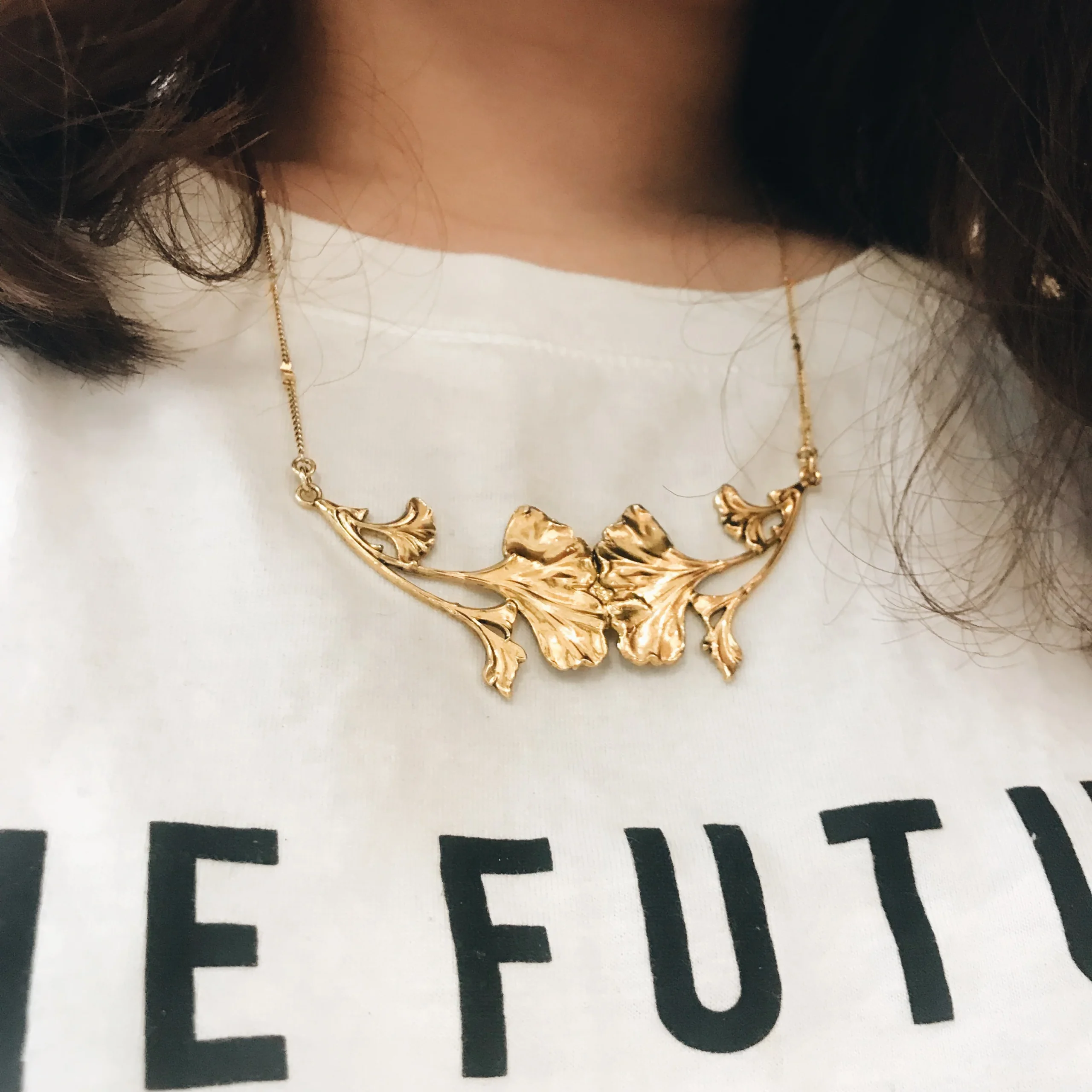 Collier Double Ginkgo Doré – Collier doré ou fin – Pierre : Onyx – Longueur : 40cm – Sans Nickel – Livré avec une pochette tissée principale