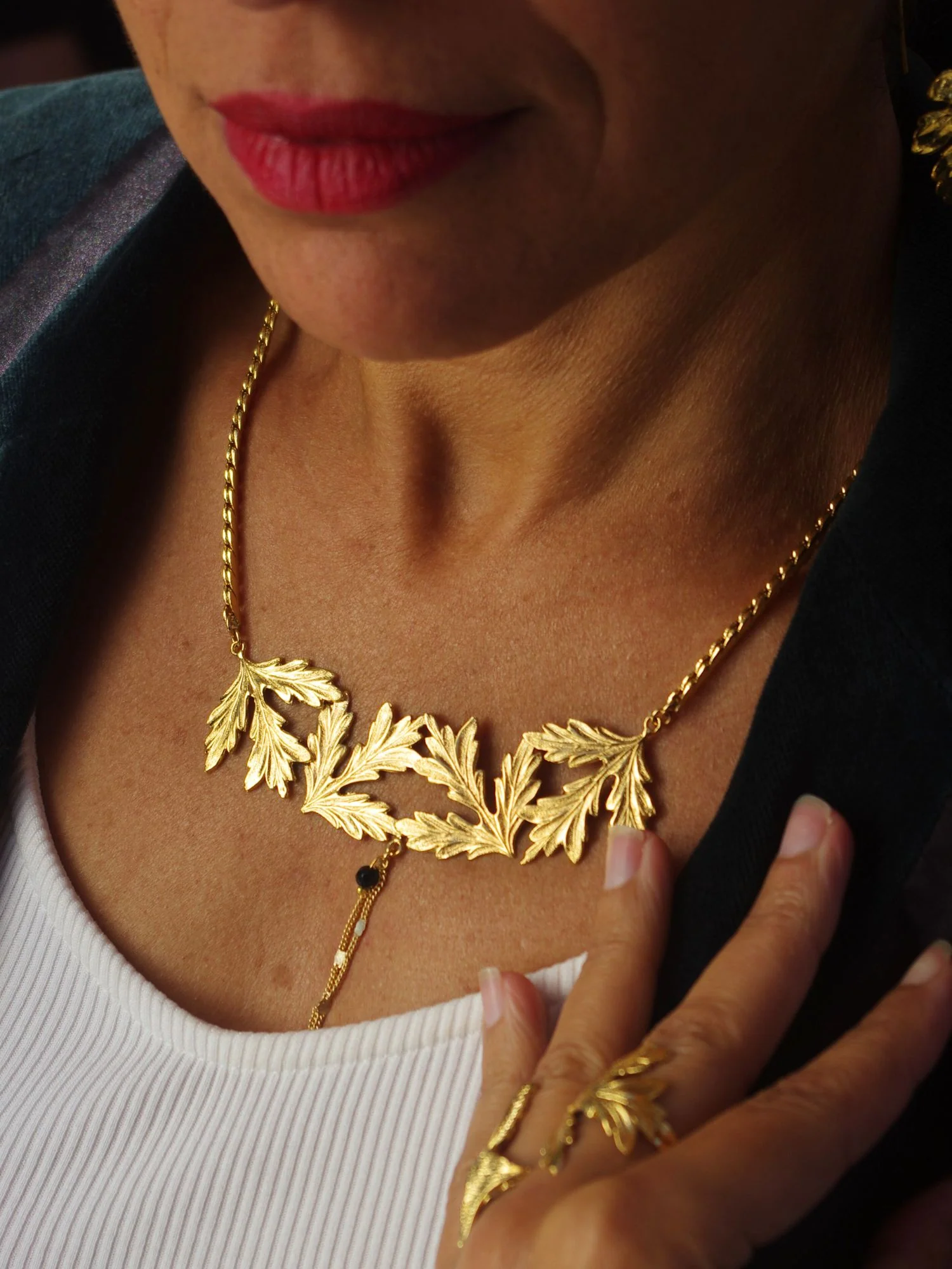 Collier feuilles Ella doré – Collier en laiton doré à l’or fin – Sans nickel – Fabriqué en France dans notre atelier parisien – Livré avec une pochette tissée main