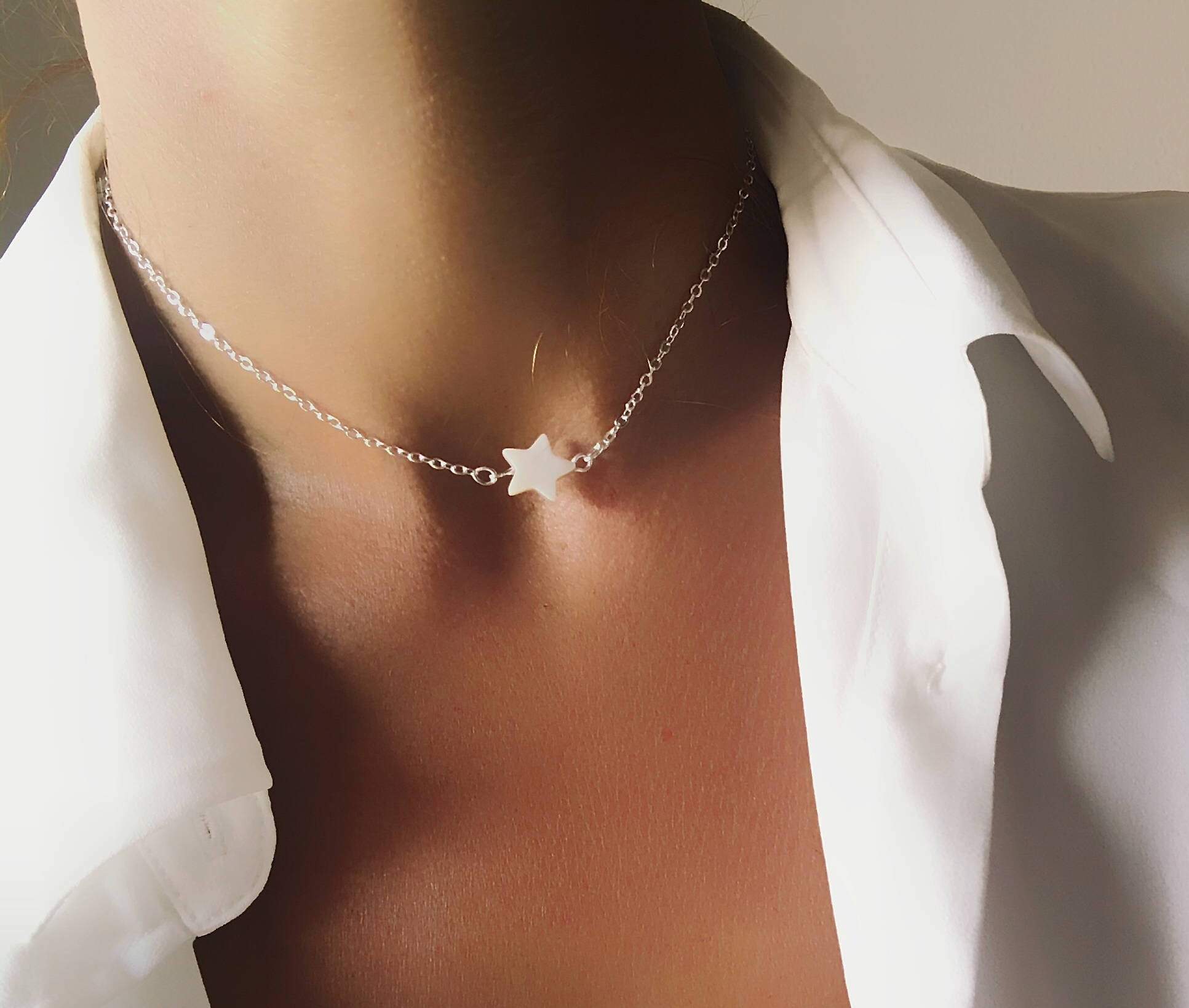 Collier étoile nacre argent. Collier fin avec pendentif nacre en metal plaqué argent. Collier court étoile nacre chaîne argentée signé Bijoux by Julie. Ce collier étoile nacre argent est réglable, déployé il mesure 38 cm + 5cm de chaine de réglage. Ce collier de créateur va magnifier votre décolleté.