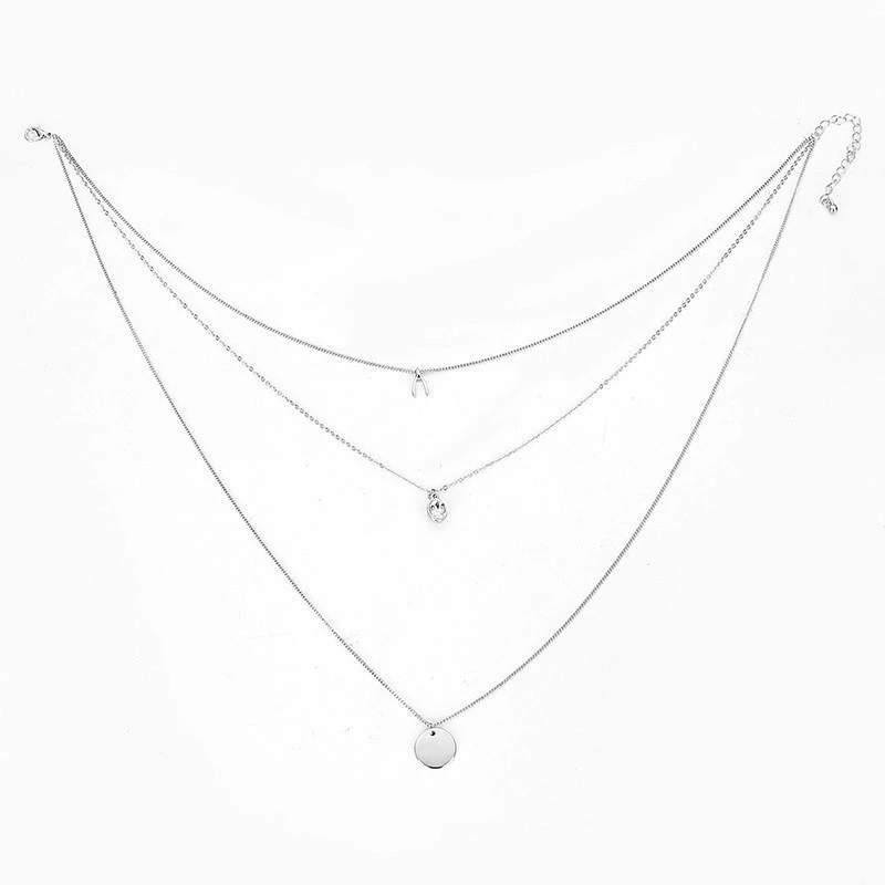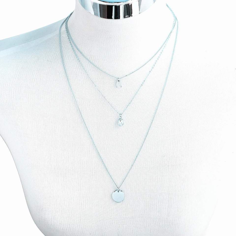 Collier multirangs original! Le collier multi rangs en métal plaqué argent , aussi disponible en plaqué or. Ce collier fantaisie en métal argenté est un incontournable de la collection 2019. Chaine: 45-60-70cm
