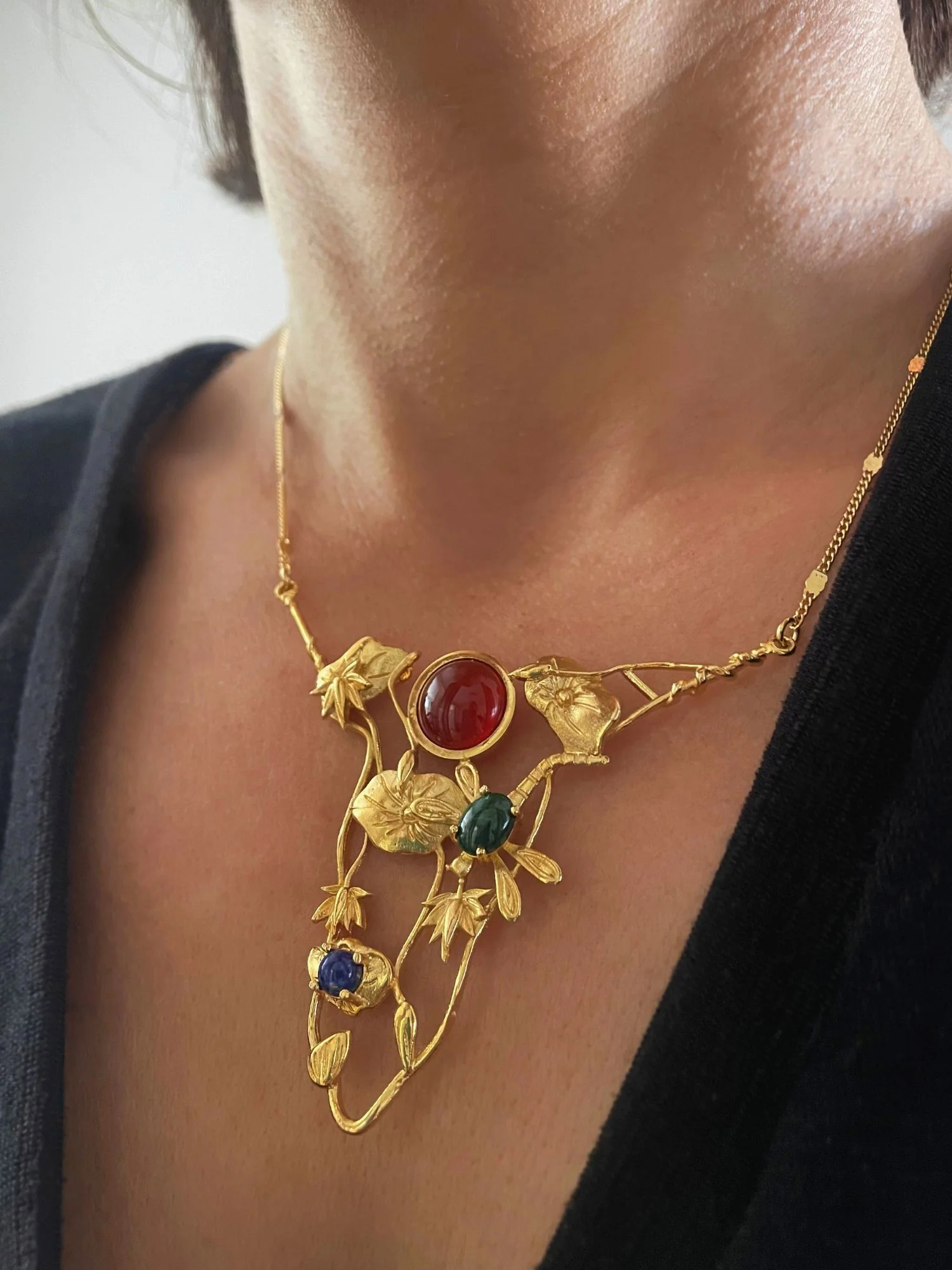 Ce collier doré à l’esprit végétal est accompagné de 3 pierres fines, dont la cornaline rouge, la malachite verte et le lapis lazuli bleu profond.