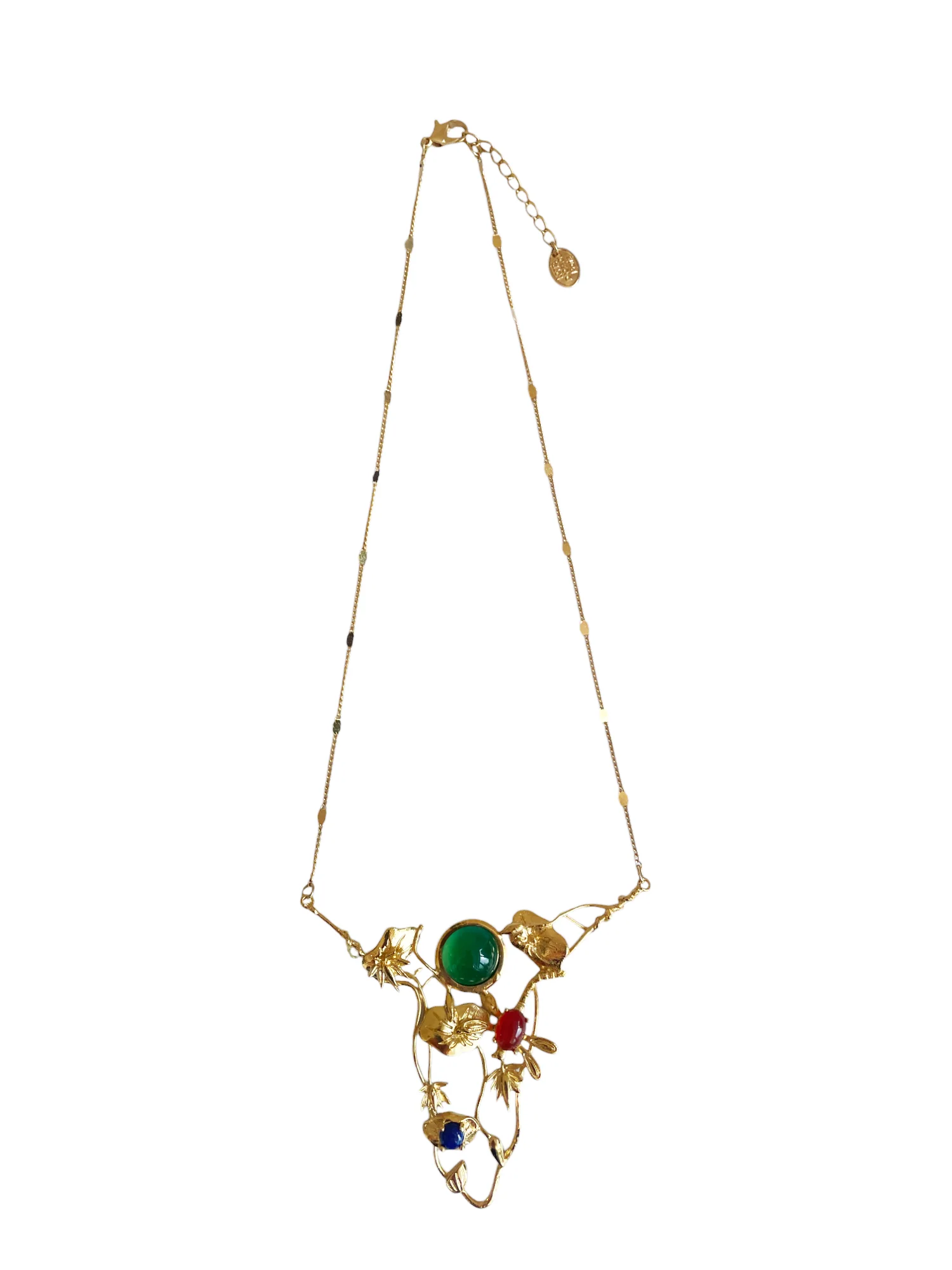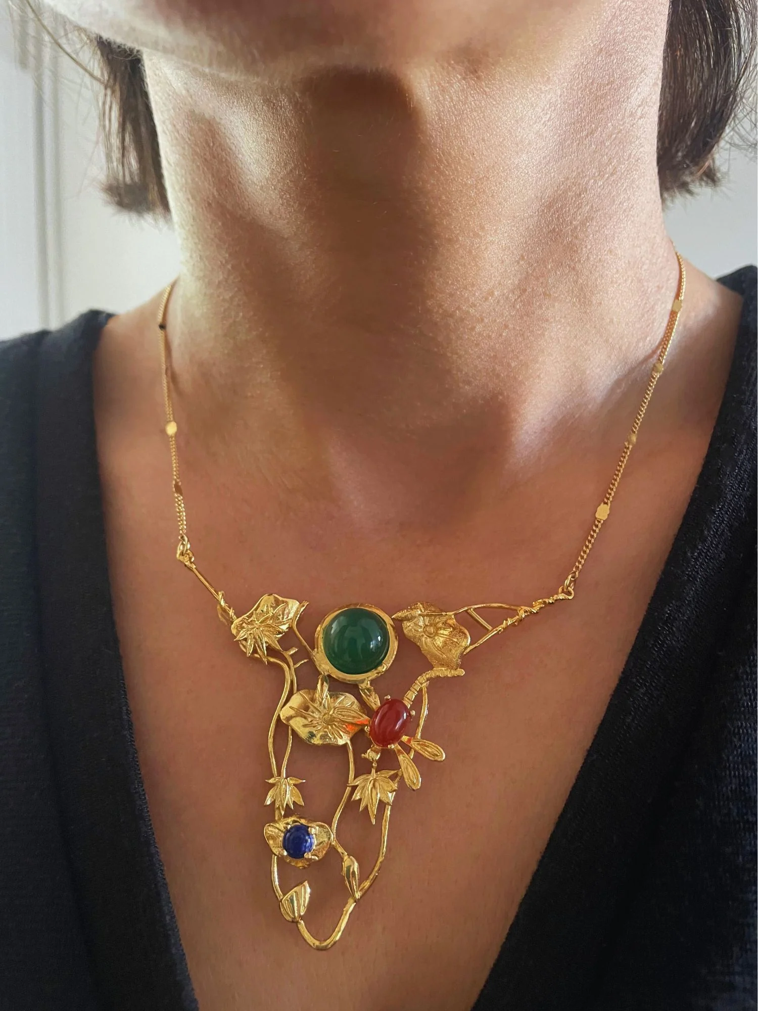 Ce collier doré à l’esprit végétal est accompagné de 3 pierres fines, dont le jade vert, la cornaline rouge et le lapis lazuli bleu profond. Il donnera à votre tenue un style très élégant. Il est tout aussi facile à porter au quotidien comme pour une cérémonie ou une occasion spéciale.