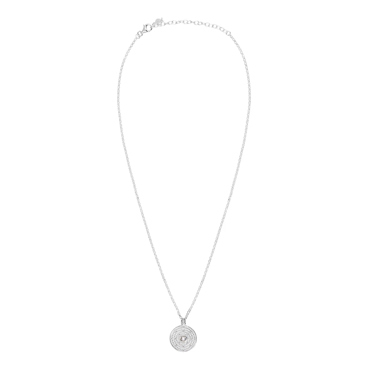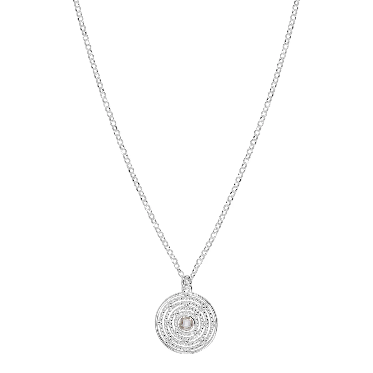 Le pendentif circulaire arbore des motifs en spirale, créant une texture visuelle captivante. Au centre, une pierre brillante rehausse l’ensemble, ajoutant une touche de lumière et d’originalité à ce bijou.