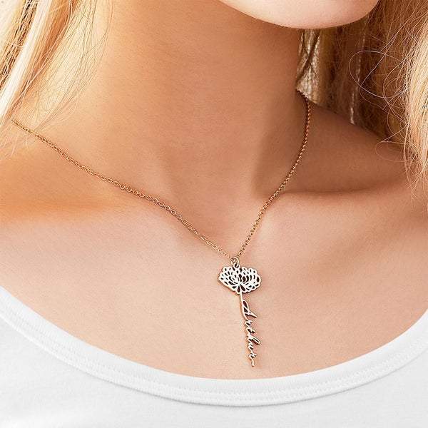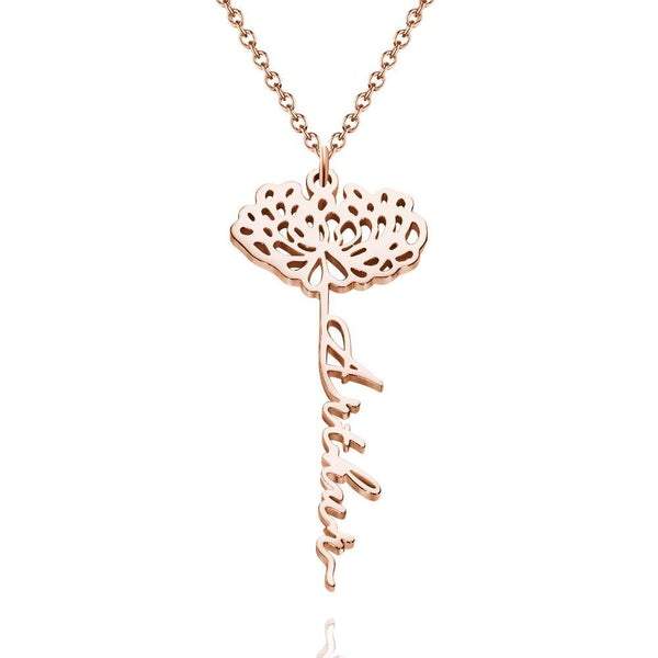 Voici le collier avec pendentif prénom pendentif fleur en acier plaqué or rose.